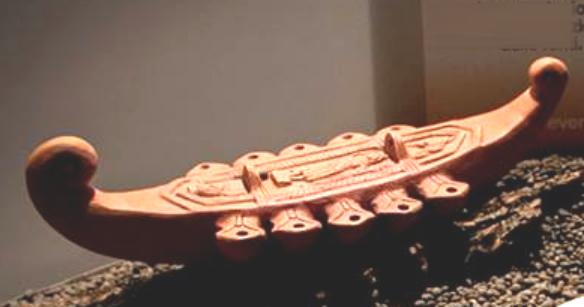 Scultura in terracotta, riproduzione di una lucerna funzionante del I sec. D. C. a forma di imbarcazione, veniva adoperata per illuminare grandi locali poiché possiede più punti di fiamma, 5 per lato. Lucerna, I sec. d.C., Ostia, Museo Ostiense. Lucerna a forma di nave, con ansa terminale a ricciolo. Al centro Iside su un basamento, con sistro nella destra, cista e ureo nella sinistra. La figura è chiusa tra due colonne corinzie. L'immagine della dea su una imbarcazione si connette al suo ruolo di protettrice del mare e delle imbarcazioni. Tali prerogative della dea dettero luogo alla cerimonia del Navigium Isidis, il cui evento culminante era il varo di una nave carica di offerte (Metamorfosi, XI,9). Dettagli: