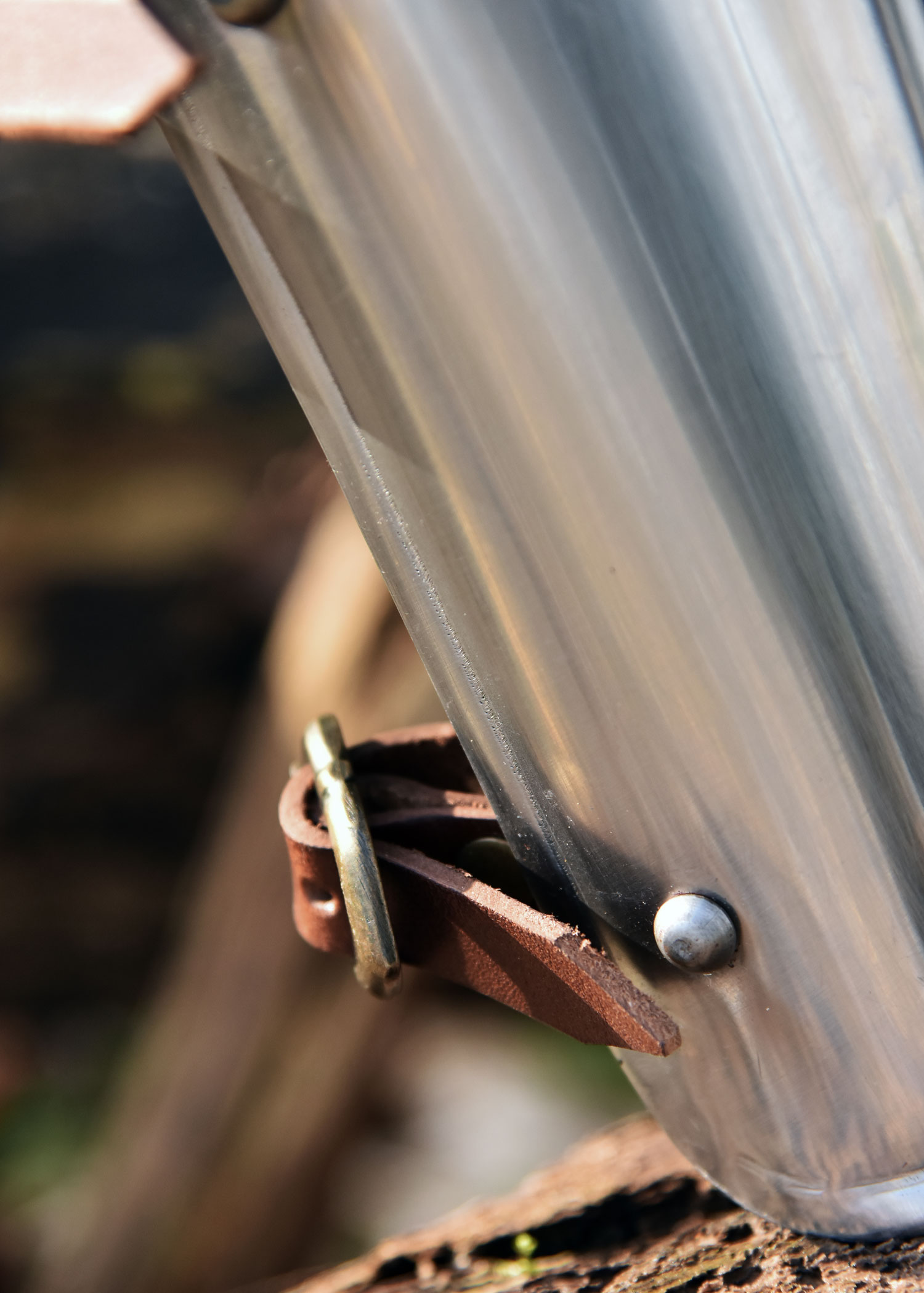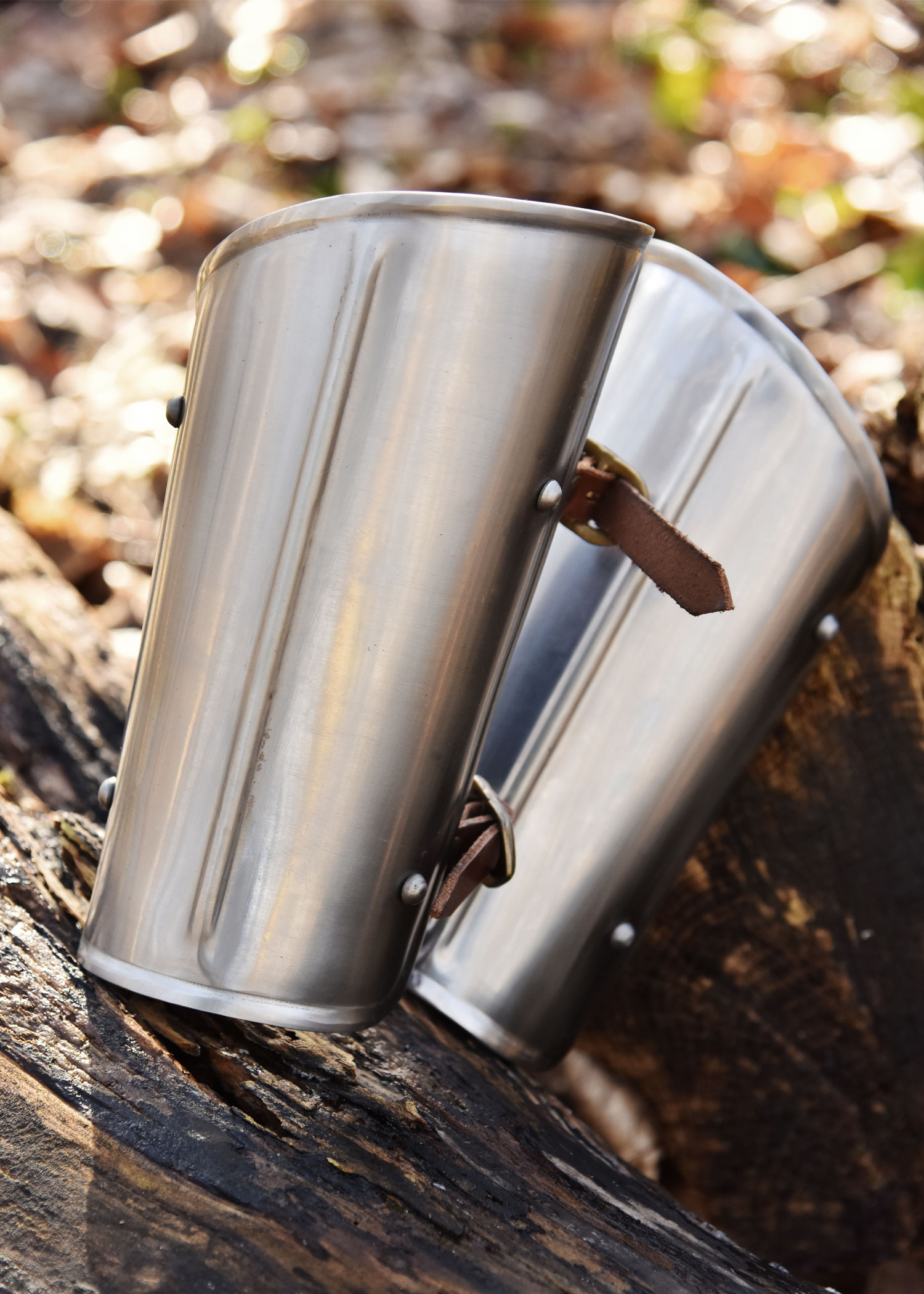protezione del braccio in acciaio Avambraccio in acciaio realizzato a mano. La nervatura centrale e i bordi piegati consentono uno spessore leggero di soli 1,2 mm di acciaio. Due robusti cinturini in pelle regolabili con fibbie sono rivettati all'interno dell'armatura. Il colore della pelle può variare. Venduto come coppia di due. dettagli : - Lunghezza: circa 21 cm - Larghezza: circa 17 cm - Spessore del materiale: circa Acciaio da 1,2 mm - Spessore della pelle: circa 2,5 mm - Finitura: lucida (leggermente oliata) - Peso: circa 700 g