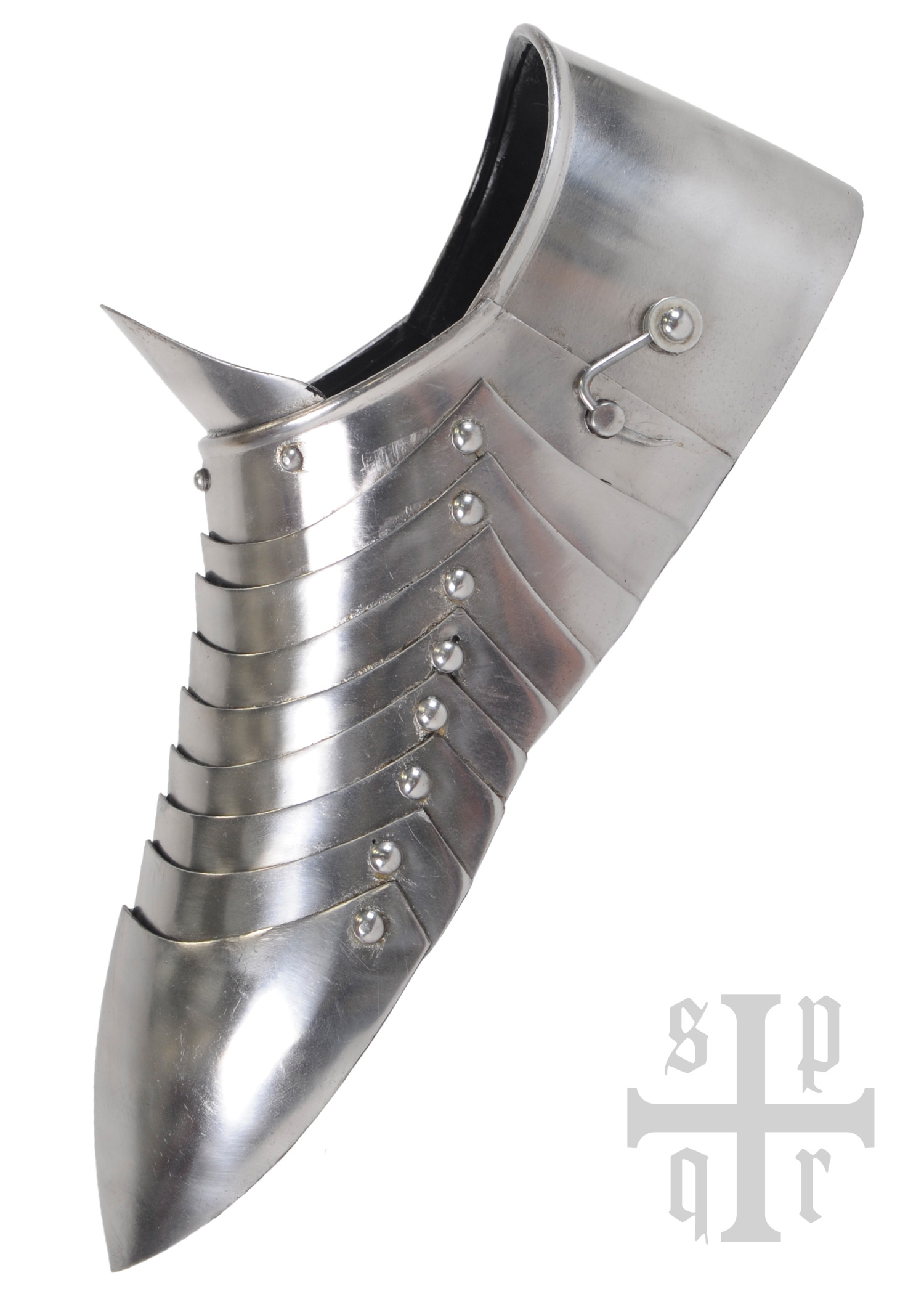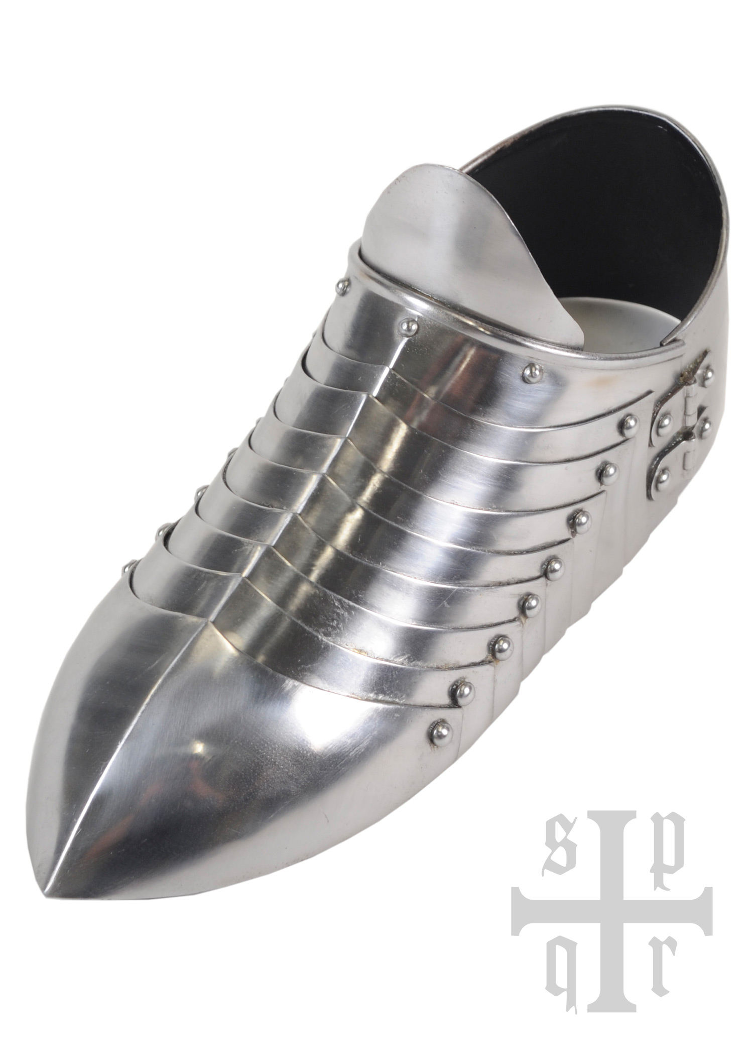 Questa armatura a piastre portatile e mobile per i piedi si basa su modelli del XIV secolo. Le guide in ferro sono forgiate a mano in acciaio da 1,5 mm, annerite all'interno per una migliore protezione dalla corrosione e dotate di cinturini in pelle sul lato inferiore. Non hanno suola e consistono in una punta appuntita ma leggermente arrotondata, diverse spinte (dalla pianta del piede alla caviglia), un "lembo" e un tallone. Tutti gli elementi sono collegati tra loro con rivetti stabili. Questa armatura articolata è adatta anche per spettacoli e larp. È ideale per ambientazioni tardo medievali e renderà la tua rappresentazione di un orgoglioso cavaliere semplicemente perfetta! È una coppia, quindi protezione per entrambi i piedi. Dettagli: tempo di consegna: 5 giorni lavorativi