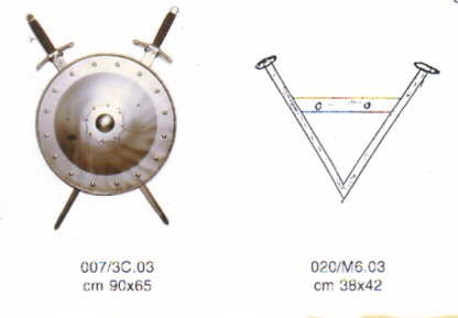 Sostegno da muro per scudo e due spade, peso 300 gr. dimensioni. 38 x 42 cm.