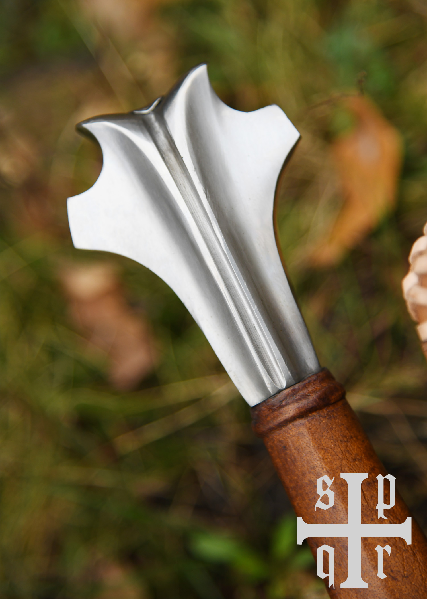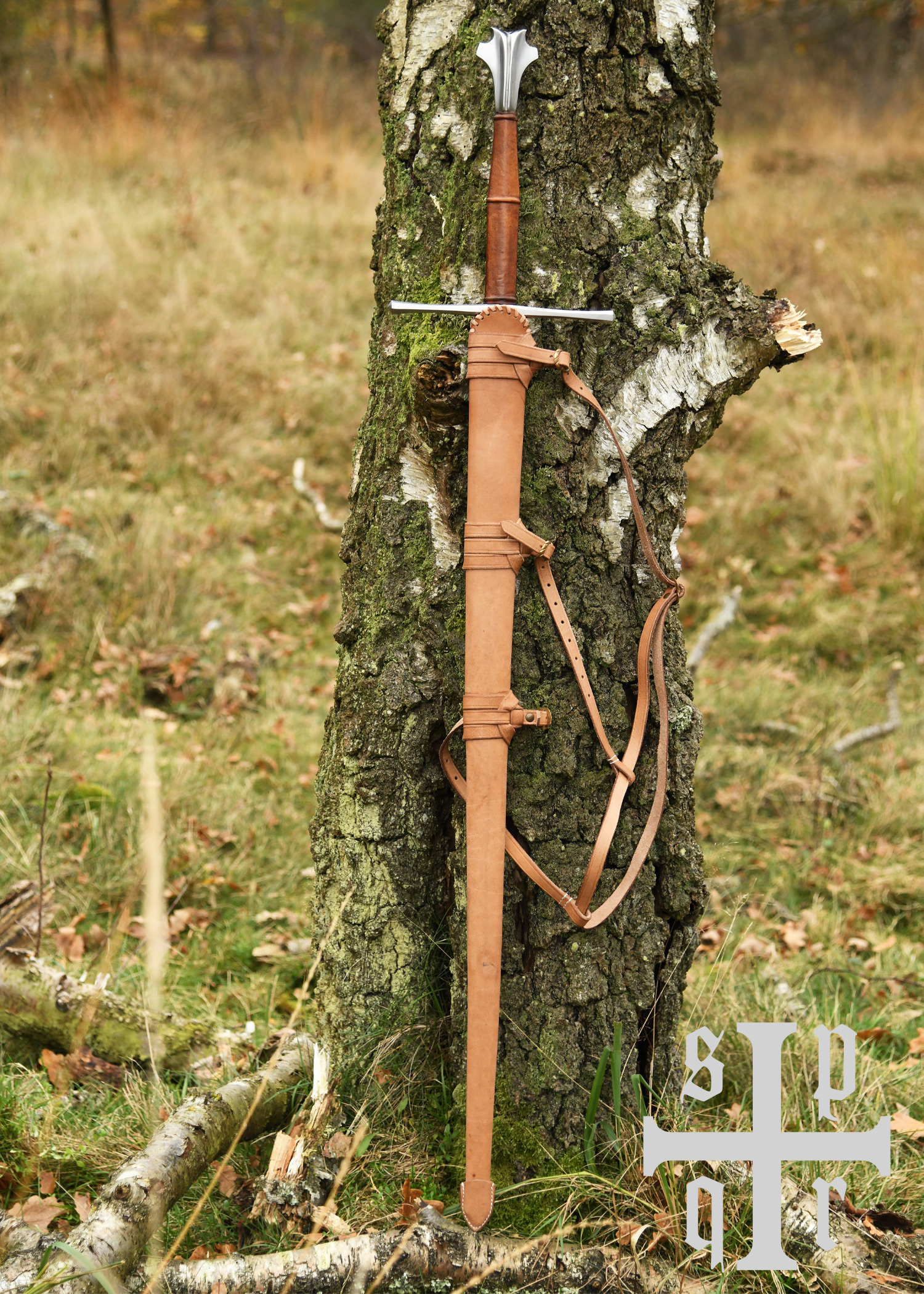 È forgiato fino al pomo e lì rivettato all'estremità del manico. La crossguard è in acciaio e l'impugnatura in legno rivestita in pelle termina con un generoso pomello a coda di pesce.