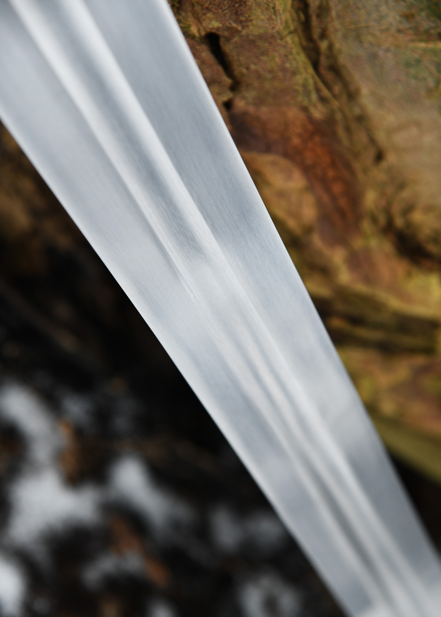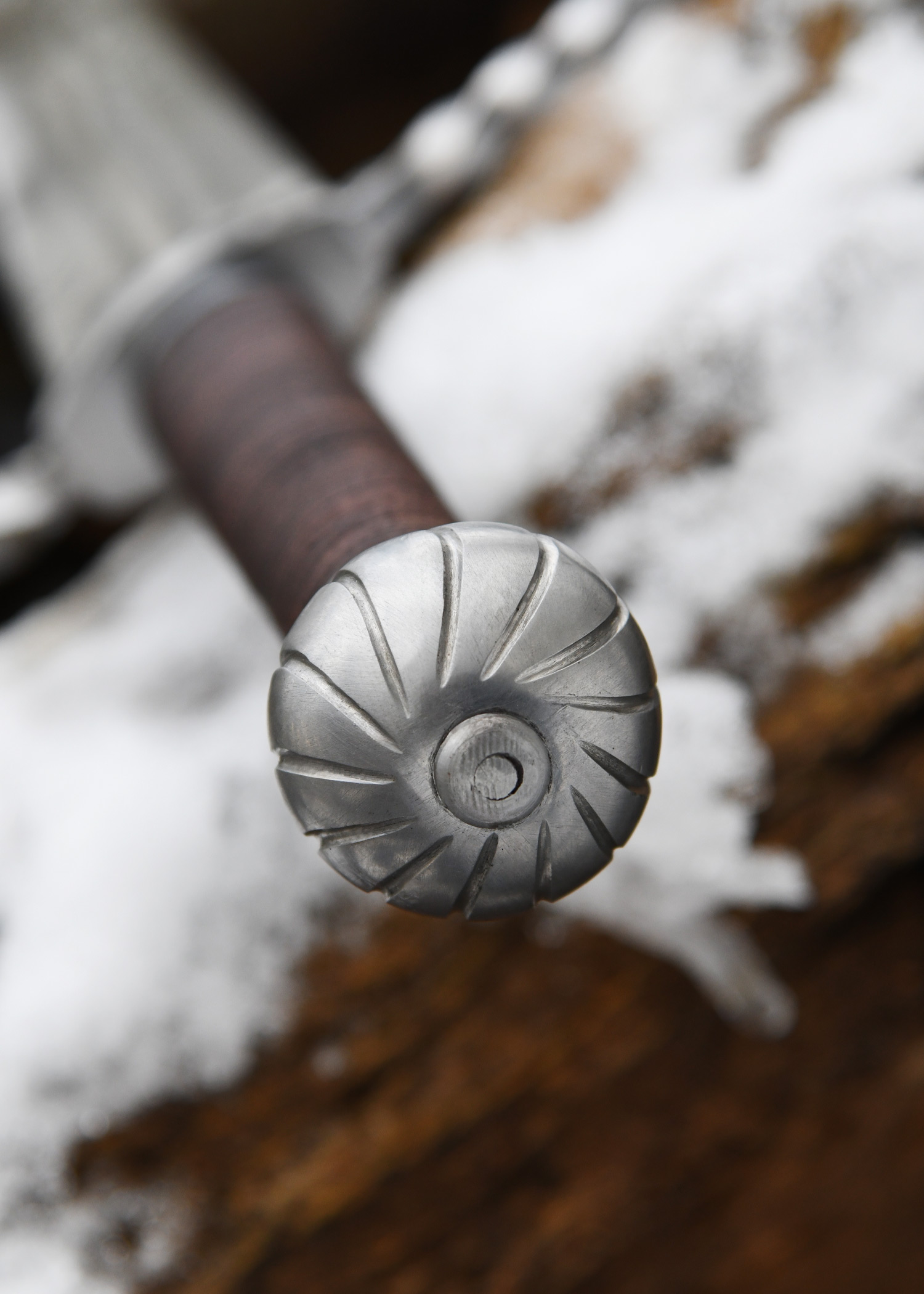 Questa ricostruzione è realizzata esclusivamente a mano. La protezione trasversale dritta e attorcigliata e il pomo sono in ghisa malleabile trattata termicamente. La lama in acciaio armonico EN45, passa attraverso il pomo e viene rivettata a mano. Il manico è avvolto da cinturino in pelle. La lama ha un pronunciato più pieno che arriva quasi a metà lama e conferisce alla spada maggiore elasticità e leggerezza allo stesso tempo.