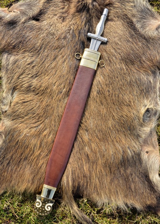 La spada ha un fodero in legno rivestito in pelle con medaglione e puntale in ottone.