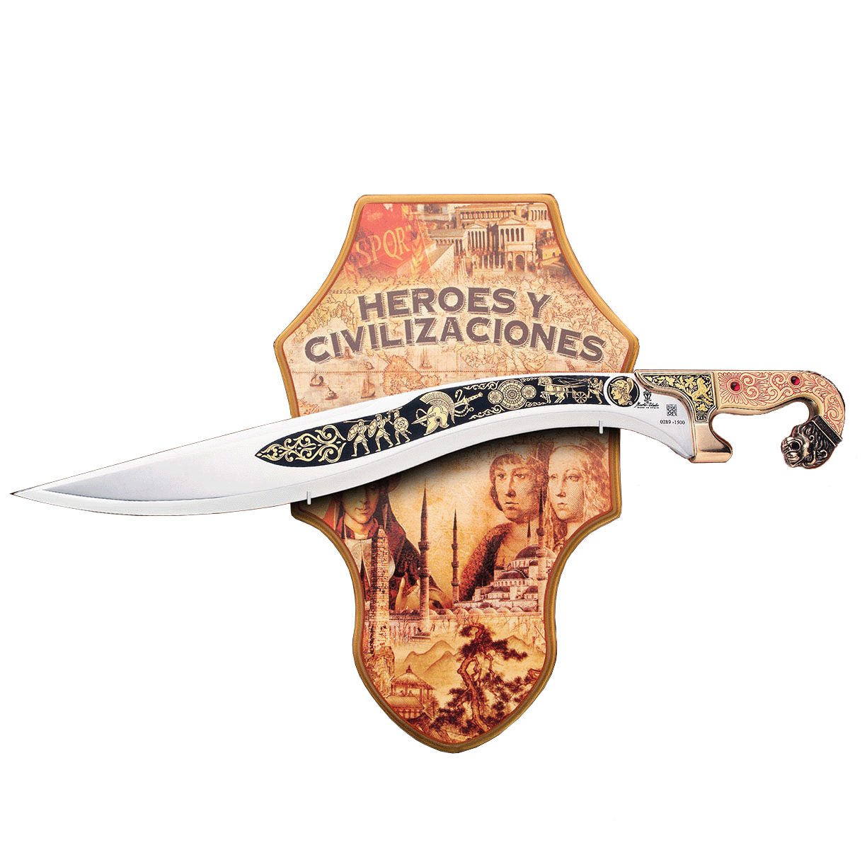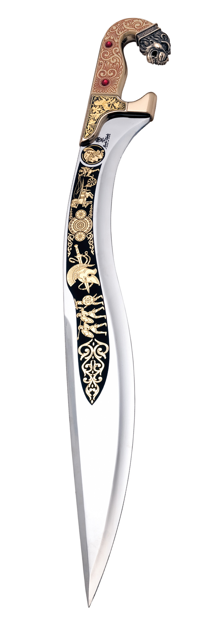 Spada di Alessandro Magno, Edizione Limitata, Marto Alessandro III di Macedonia, noto come Alessandro Magno, Re di Macedonia, nato il 21 luglio 356 a.C. Conquistatore dell'Impero Persiano. Alessandro Magno, considerato la suprema figura politica dell'antichità, un grande stratega militare e creatore di un corpus di opere di immenso significato culturale, è considerato uno dei comandanti militari più brillanti della storia. Non fu solo un valoroso condottiero che pianificò le sue campagne con grande brillantezza, ma mostrò anche un vivo interesse per l'Impero Persiano e le sue azioni, così come per l'invasione persiana della Macedonia, fin dalle sue prime fasi. Affrontò il potente esercito persiano al comando di Dario III nella battaglia di Iso nel 333 a.C. e ottenne una clamorosa vittoria. Il re persiano fuggì verso est con tutte le sue forze, consegnando ad Alessandro il tesoro reale, la Fenicia, la Palestina e l'Egitto senza opporre resistenza. Fu proclamato figlio del dio Amon e fondò Alessandria, commissionando la costruzione del Faro di Alessandria. Entro il 327 a.C., aveva conquistato un impero che si estendeva dalla Grecia all'Asia Minore e all'India. Condusse una vittoriosa campagna di oltre 32.000 chilometri, durata 11 anni. Dettagli: - Materiale della lama: acciaio inossidabile 420 - Lunghezza totale: circa 71 cm Nota: