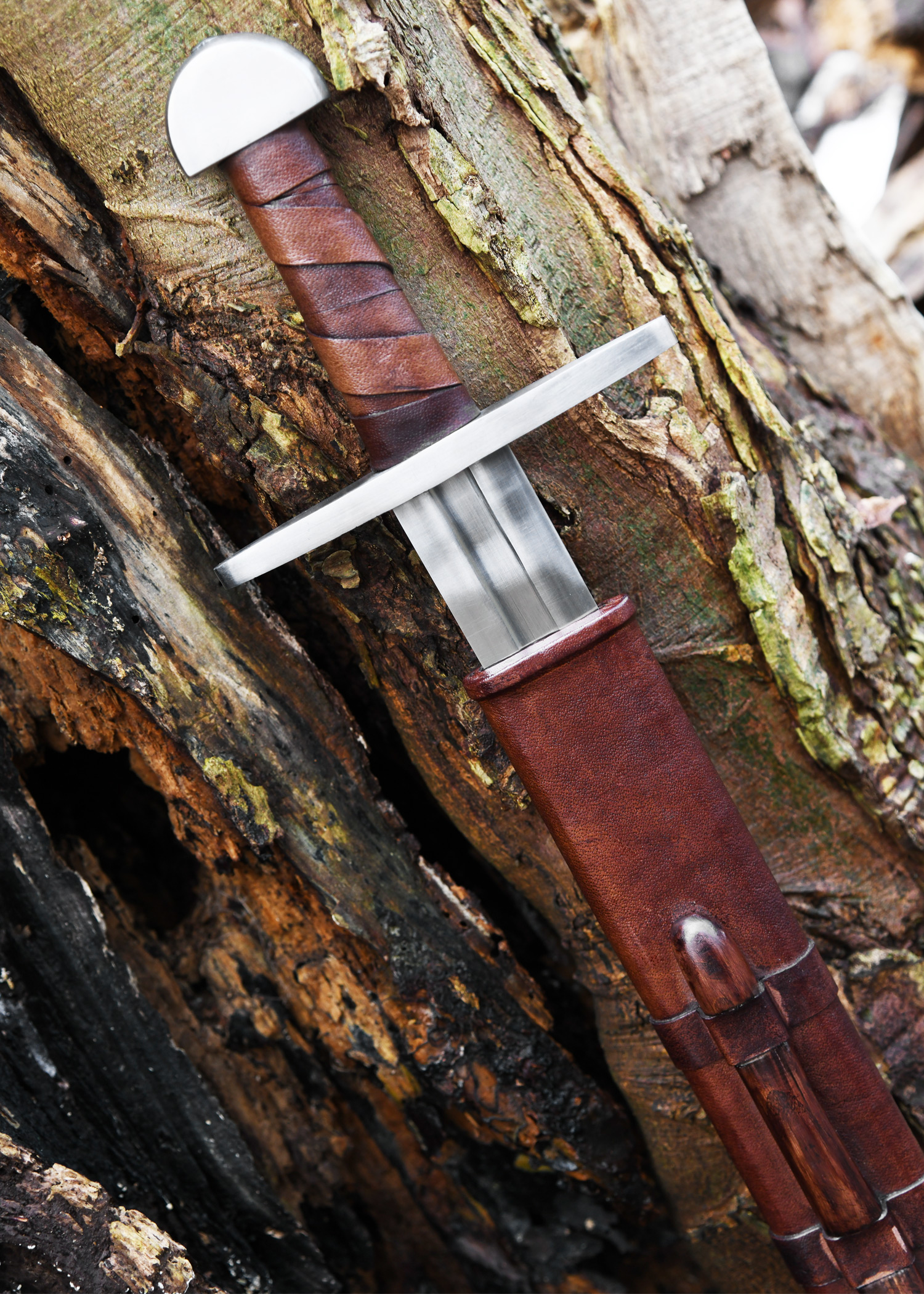 Spada Normanna esclusivamente artigianale. La protezione e il caratteristico pomo sono realizzati in ghisa malleabile termotrattata. La lama in acciaio per molle è temperata ad olio fino a 48-50° Rockwell e rivettata a mano al pomo. L'elsa è fasciata in pelle. La lama ha un caratteristico fuller che offre sia una grande flessibilità che un peso inferiore. I bordi della lama sono smussati e la punta è arrotondata per sicurezza.
