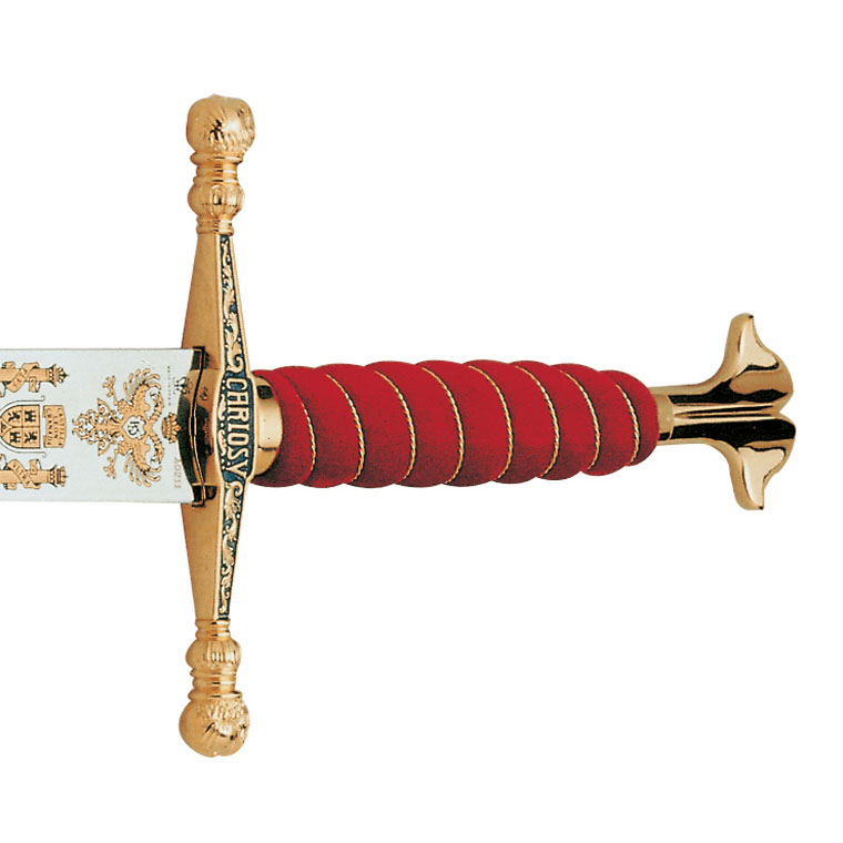 Riproduzione di una spada risalente all'inizio del XVI secolo appartenuta all'Imperatore Carlo V e oggi conservata presso la Real Armeria di Madrid. La spada ha lama in acciaio decorata nella parte superiore con incisioni in oro e nero raffiguranti l'aquila bicipite e gli stemmi dei possedimenti Asburgici, contornati da un collare. Il fornimento è in metallo fuso dorato con bracci diritti e pomolo bilobato. L'impugnatura è avvolta in velluto rosso e una cordicella in metallo dorato. Lunghezza totale 120 cm.