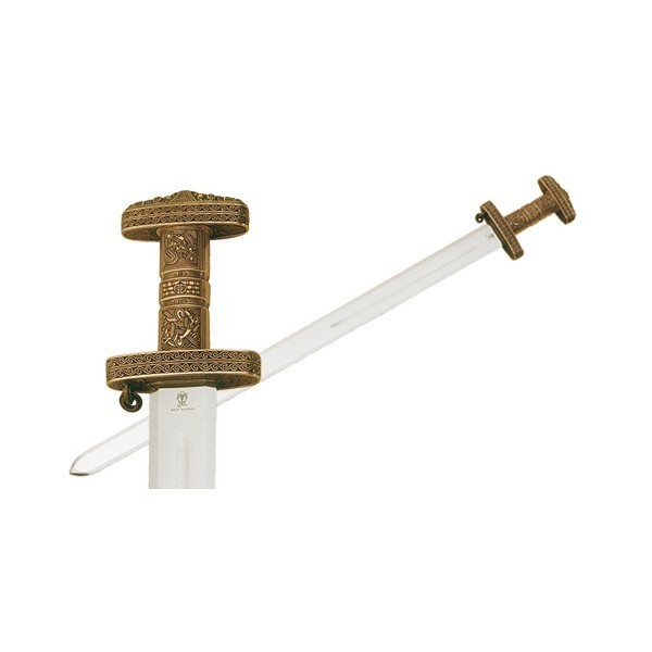 Spada vichinga del IX-X secolo, caratterizzata da una larga lama in acciaio con sguscio centrale per un terzo della lunghezza. Il fornimento in metallo fuso è lavorato finemente con incisioni geometriche e astratte. Elso corto ed ellissoidale, impugnatura diritta e pomolo speculare all'elso, però, di dimensioni minori. Lunghezza totale: 92 cm - 36 pollici di 1/2. Note!
