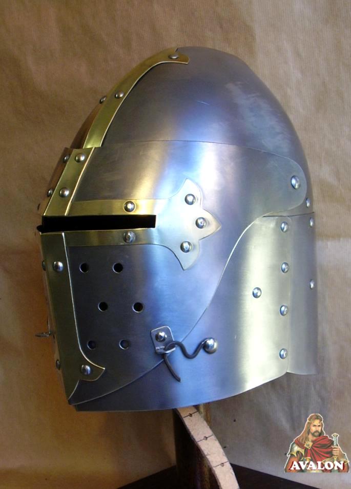 Ricostruzione autentica di un elmo Templare da combattimento, si tratta di un elmo a coppo ogivato con visiera.