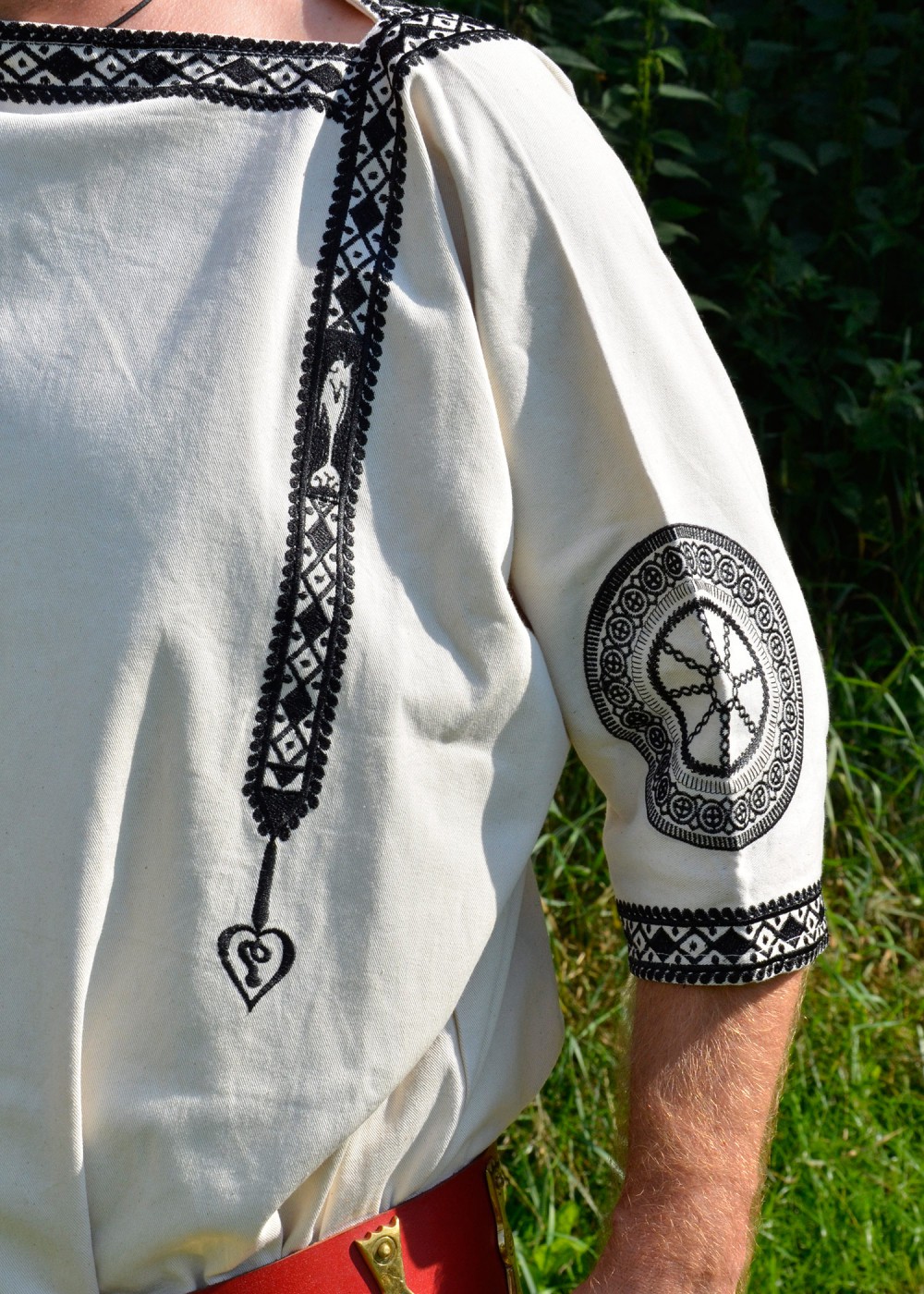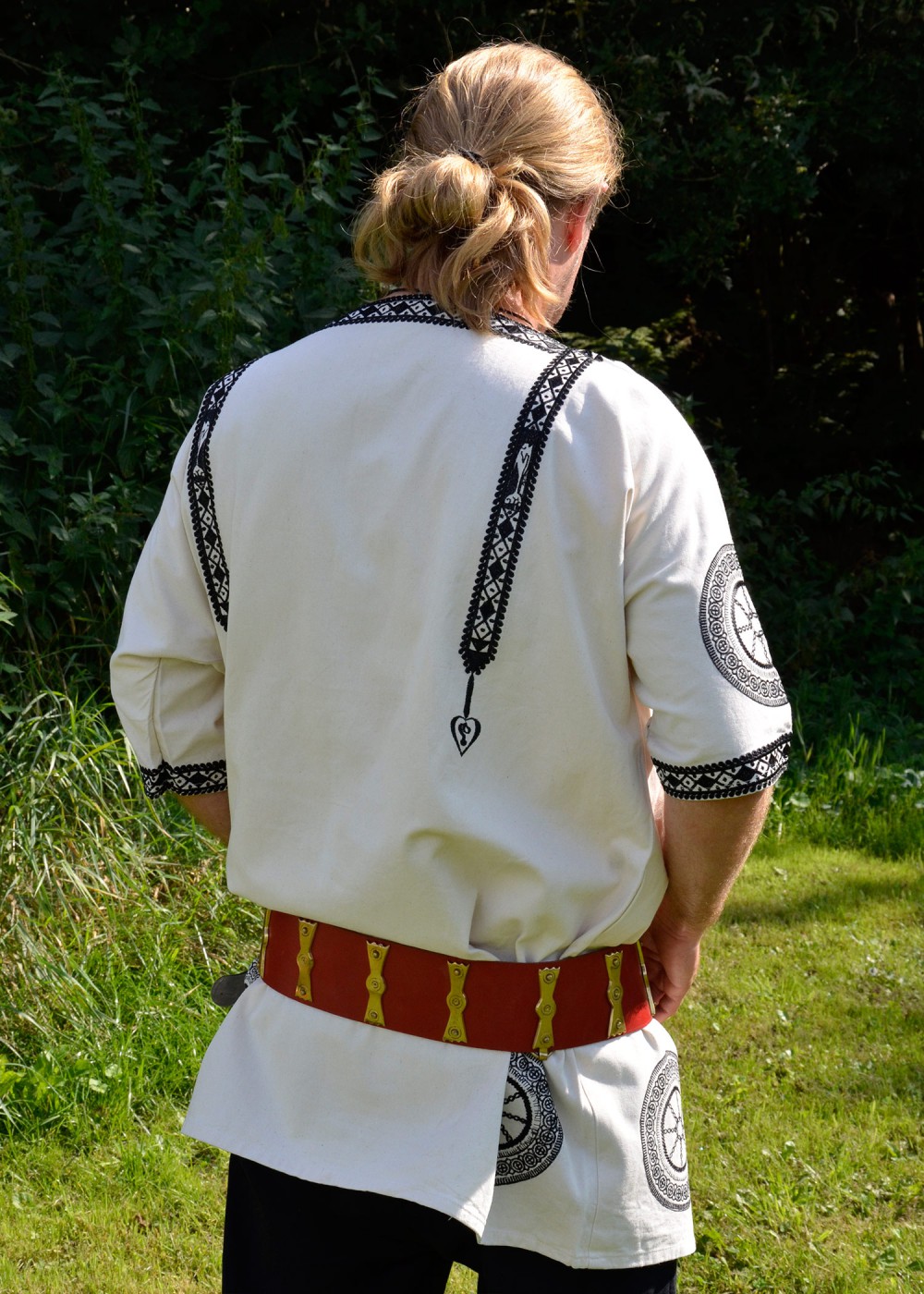 Tunica romana è presente un ricamo con motivi tipici romani, per esempio simboli sole e delfini, colore bianco. Dettagli: