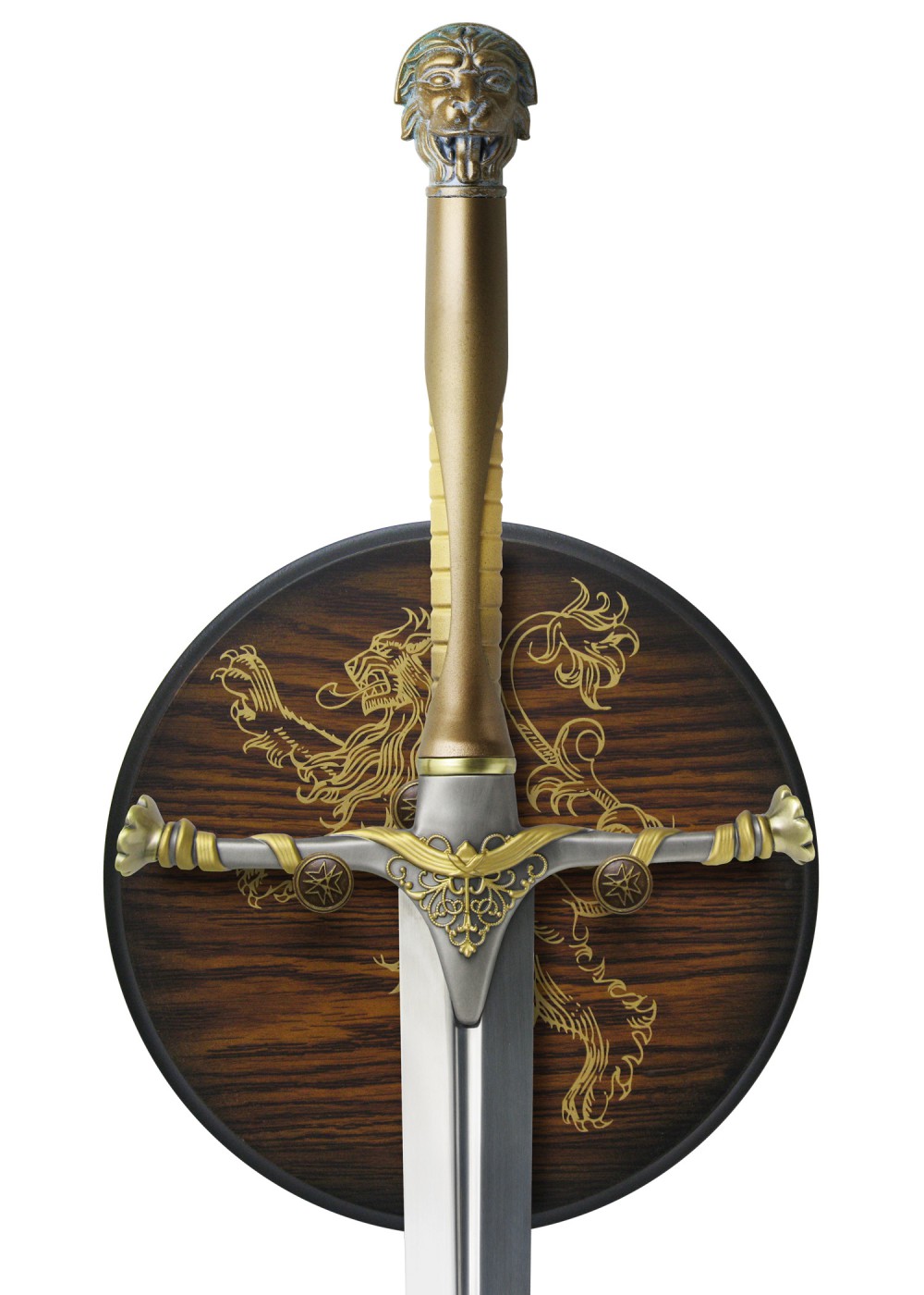 Replica ufficiale rilasciata dalla HBO's hit TV series Game of Thrones® Jaime Lannister, figlio di Lord Tywin Lannister di Casterly Rock, fratello gemello di Cersei e fratello maggiore di Tyrion, è un cavaliere del Kingsguard. È conosciuto in tutti i Sette Regni come The Kingslayer, un soprannome derubiante che ha guadagnato dopo aver girato la propria spada sul re Mad Reys II. Targaryen (in violazione del suo giuramento come membro del Kingsguard) e ucciderlo ai piedi del trono di ferro durante il sacco di atterraggio del re, alla conclusione della ribellione di Robert. Questa replica della spada di Jaime Lannister è autorizzata ufficialmente riprodotta fedelmente a quella usata nella serie TV show Game of Thrones®. È stata realizzata con particolare attenzione ai dettagli per riprodurre con esattezza le caratteristiche autentiche che si trovano sul pezzo originale. Rigorosamente limitato a 2500 pezzi, ogni spada è serializzata e viene fornita con un certificato di autenticità e un supporto a parete per la visualizzazione. Dettagli: