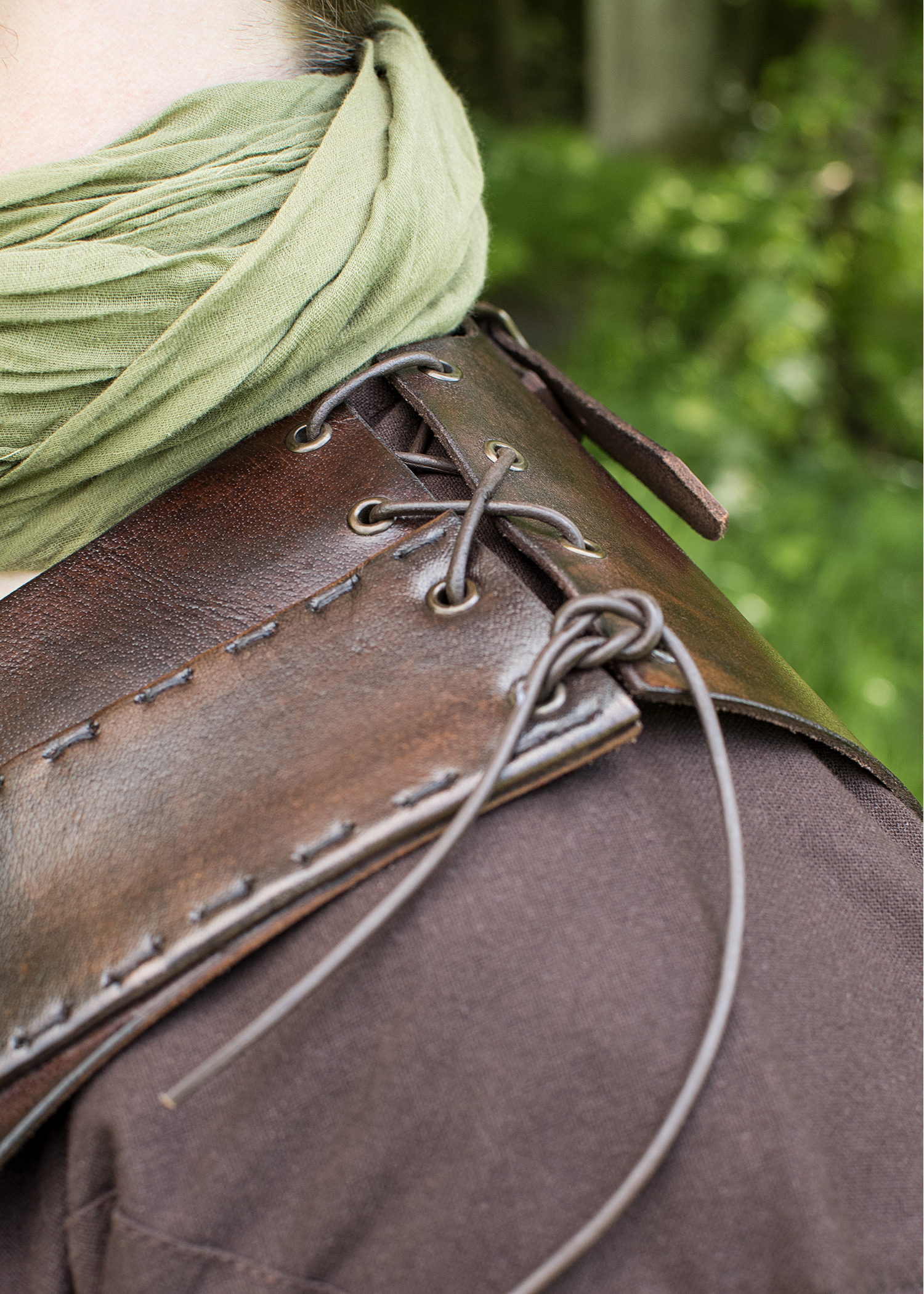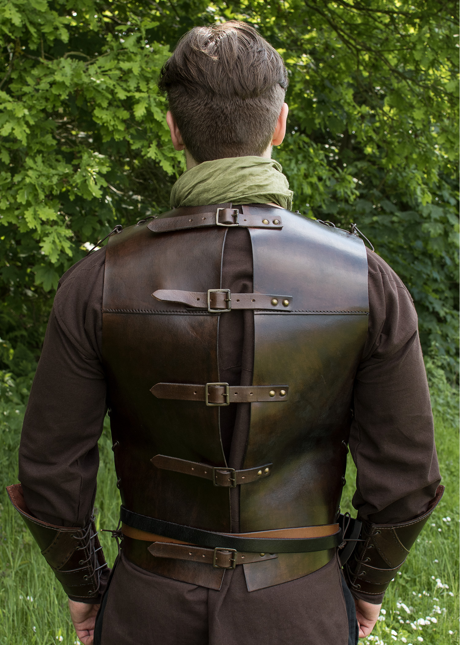 Questa robusta ma leggera armatura per la parte superiore del corpo, è realizzata in pelle conciata al vegetale di alta qualità. La parte anteriore è decorata (e rinforzata) da due cinturini in pelle all'altezza del petto che formano un motivo a croce. Le cuciture stabili garantiscono una lunga durata.