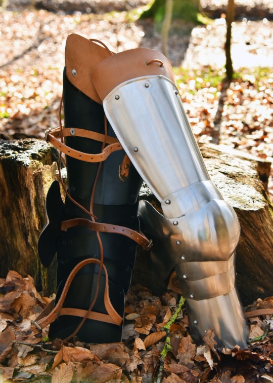 Replica indossabile, completamente snodabile e pronta per la battaglia dell'armatura a piastre tardo medievale per le gambe. L'ingranaggio della gamba è costituito da una guarnizione a scorrimento singolo, gobba del ginocchio e tubi delle gambe a triplo scorrimento (stinchi).