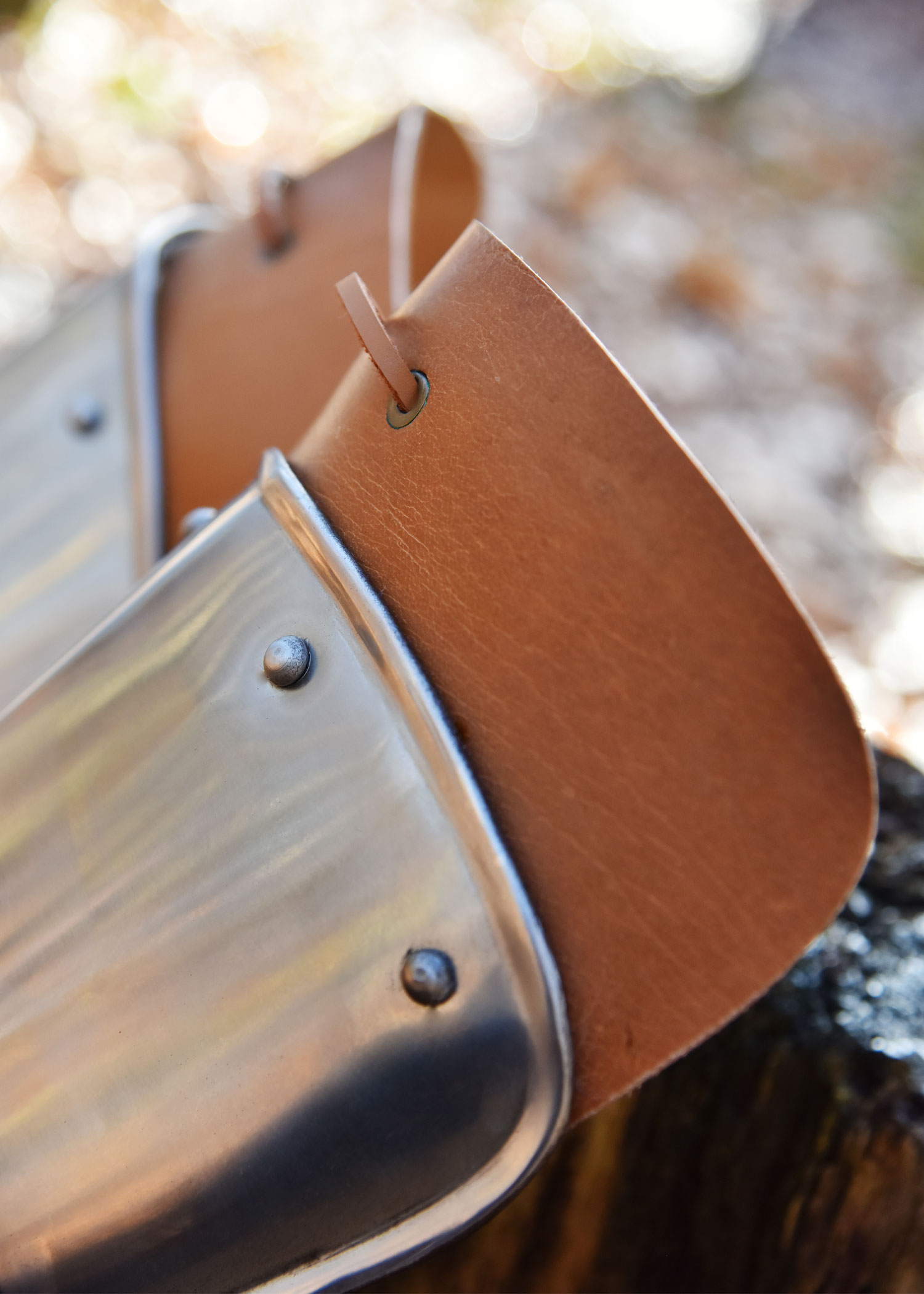 È realizzato a mano in acciaio spesso circa 1,2 mm. Lembi di cuoio sono rivettati al bordo superiore dei sigilli e sono presenti anche cinghie di cuoio per il fissaggio alla cintura. Sul retro sono presenti tre cinturini con fibbie per il fissaggio individuale alla gamba stessa.Adatto per show combat, costumi e LARP.