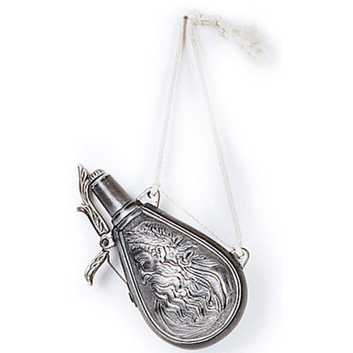 Fiasca portapolvere da sparo per pistole a focile e fucili ad avancarica in metallo fuso con corpo inciso con profilo virile cinto da corona d'alloro. Dotato di levetta azionabile per apertura e chiusura del tappo e di cordina bianca per appenderla al muro o alla cinta. Dimensioni 16 X 10 X 6.