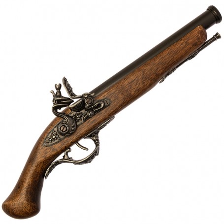 Pistola a pietra focaia, interamente realizzata in legno con canna e fornimenti in metallo fuso brunito. Riproduzione non funzionante.Lunghezza totale 37 cm.