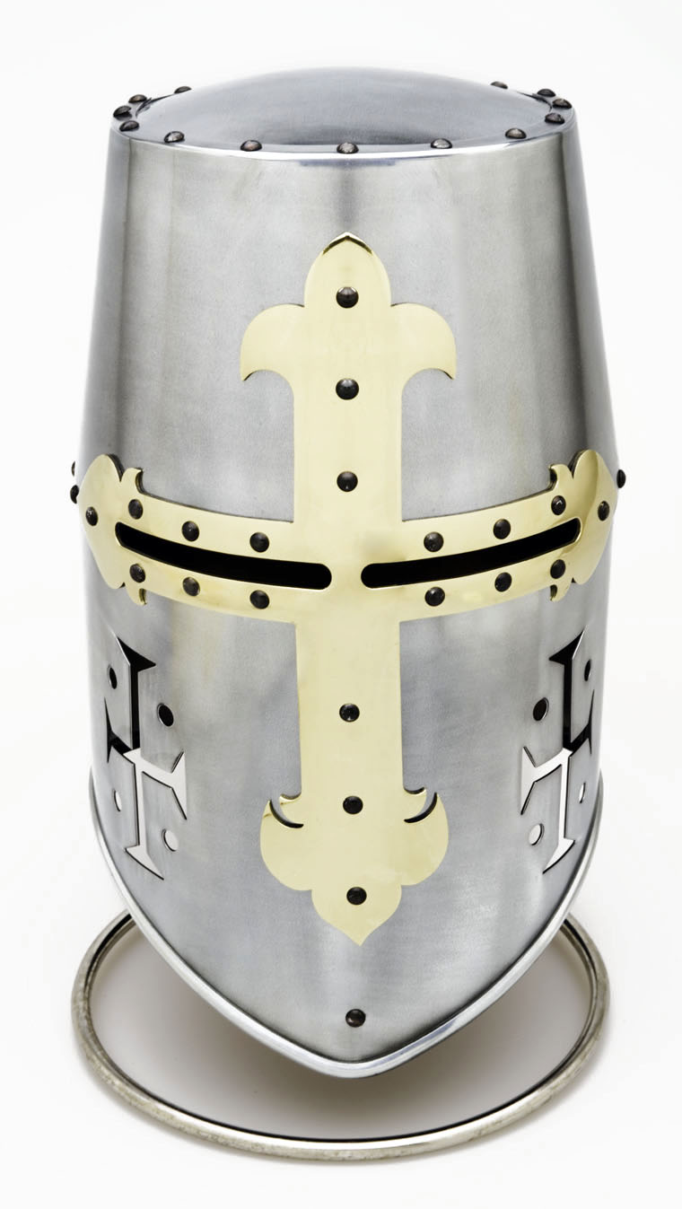 L'elmo cosiddetto “Pentolare” fu il tipico elmo usato dai cavalieri crociati e templari in special modo per tutta la durata delle Crociate. Il suo nome deriva dalla forma molto simile a quella di una pentola a sua volta dovuta dalla necessità di offrire la maggior protezione possibile alla testa. Ciò avveniva perciò a discapito della capacità visiva che era ridotta alla sola visione frontale e per questo era usato per lo più dalla cavalleria nelle cariche o nei tornei. Questo modello in ferro è arricchito da una croce in ottone che serviva a indicare l'appartenenza del cavaliere all'esercito di Dio e da una serie di trafori anch'essi a forma di croce utili per migliorare l'ingresso dell'aria all'interno dell'elmo. L'elmo è fornito insieme ad un pratico espositore. Misure 35 centimetri.