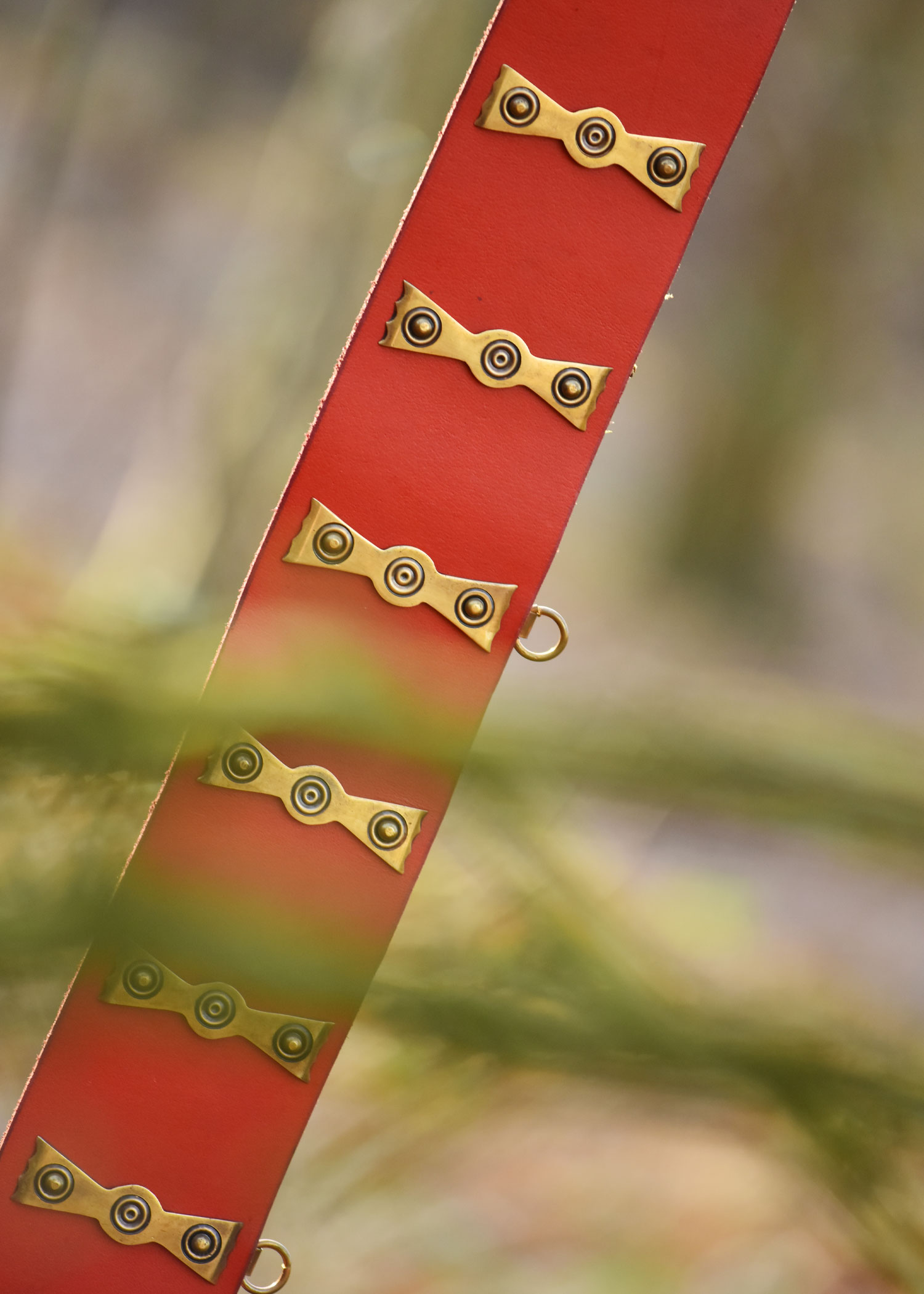 La cintura è composta da ca. Pelle bovina marrone spessa 3 mm ed è dotata di dieci decorazioni in ottone a forma di fuso e di una massiccia fibbia della cintura in più parti. Alla cintura sono fissati anche due anelli di ottone, sui quali si può indossare un pugnale (pugio), una spada (gladius o spatha) o un marsupio.