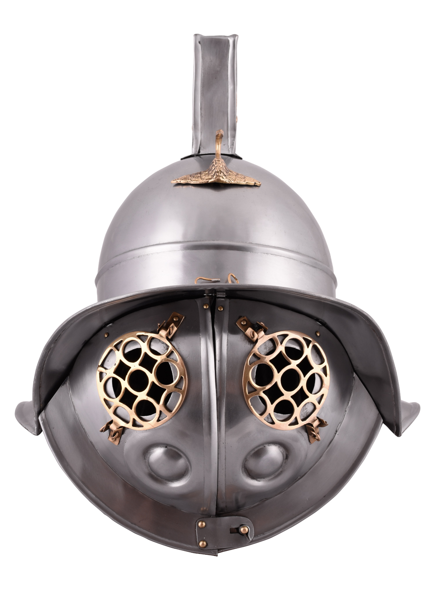 Elmo da Gladiatore Thraex, I Secolo d.C. apparteneva ad una delle categorie gladiatorie pesanti.Questa riproduzione è realizzata in acciaio di alta qualità e decorata con varie applicazioni color ottone sulla caratteristica cresta e sulla fronte. La visiera è appesa a tre piccoli cardini ed è fissata con una fibbia girevole. È incluso un cappuccio imbottito.