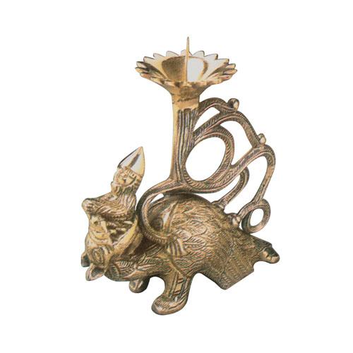 Candelabro riprodotto in stile medievale con il portacandela sostenuto da una base modellata in forma di bestia che divora un guerriero. Realizzato interamente in metallo ottonato anticato. Metallo ottonato anticato