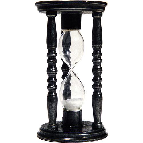 | Clessidra da tavolo. Il supporto è in metallo fuso, composta da due basi circolari e tre colonnine sagomate. La doppia ampolla in vetro al centro della struttura ha le estremità inserite in due cannoni in metallo che si protendono dalle basi. La quantità di sabbia che scorre al loro interno è tarata per due minuti di tempo. Disponibile in due finiture: brunita (come vista nell'immagine) e ottonata (oro antico). Diametro base 7 cm - altezza 13 cm