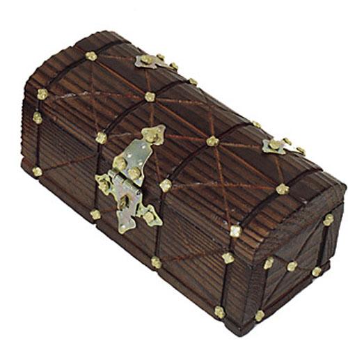 | Cofanetto in legno a forma di baule interamente realizzato in legno lavorato a mano. Provvisto di cerniera con serratura in ferro. Ornato con borchie in metallo ottonato. Dimensioni 10 x 22 x 10 cm.
