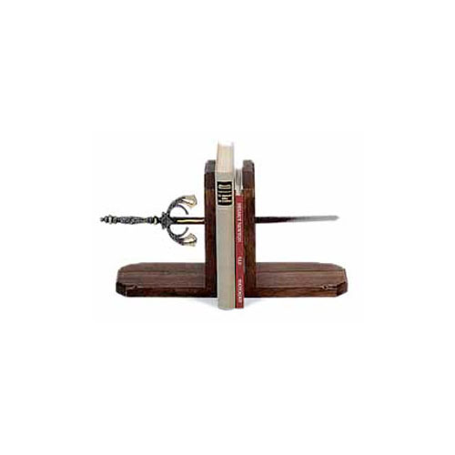 | Coppia di fermalibro in legno sagomato. Sul fianco di ognuno dei terminali è fissata una delle parti (elsa e lama) di uno spadino con elsa spagnola tipico del XVI secolo diviso a metà, in modo che questo dia l'impressione di trapassare il fermalibro quando unito. Dimensioni 34 x 21 x 10 cm.