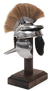 Riproduzione in miniatura di un elmo romano di tipo Imperiale Gallico risalente al I secolo d.C. Equipaggiato con un cresta longitudinale in crine di cavallo bianco, veniva indossato da legionari graduati come l'Optio. Interamente realizzato in ferro lavorato a mano con rifiniture in ottone e provvisto di piedistallo in legno. Peso 235 gr. altezza totale circa 20 cm.