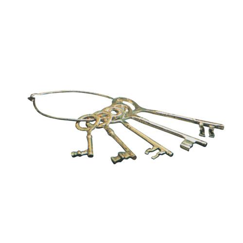 | Set di cinque chiavi di differente misura e forma inserite in un anello metallico per essere portate insieme da cui possono essere estratte e riposte. Realizzate interamente in metallo con finiture in ottone.