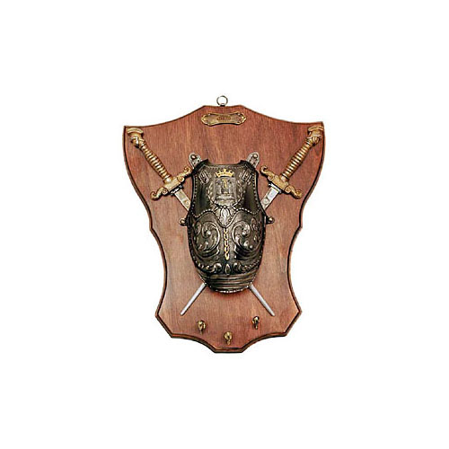 | Pannello in legno sagomato, provvisto di occhiello metallico per essere appeso alla parete. Espone due stiletti con lama in acciaio e fornimento in metallo fuso ottonato che si incrociano dietro un pettorale in miniatura in metallo brunito decorato a sbalzo. Sul fondo, tre ganci in metallo possono essere usati all'occorrenza come portachiavi. Dimensioni 33 X 27 cm.