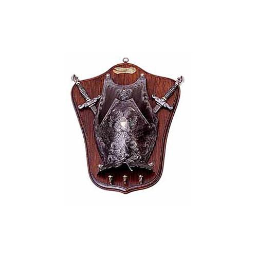 | Pannello in legno sagomato, provvisto di un occhiello per essere appeso alla parete.  Espone un pettorale da corazza in metallo brunito, effigiato con un'aquila bicipite incisa e due stiletti realizzati in metallo fuso che si incrociano dietro. Sulla base sono fissati tre ganci in metallo che fungono all'occorrenza da portachiavi. Dimensioni 37 x 29 cm.