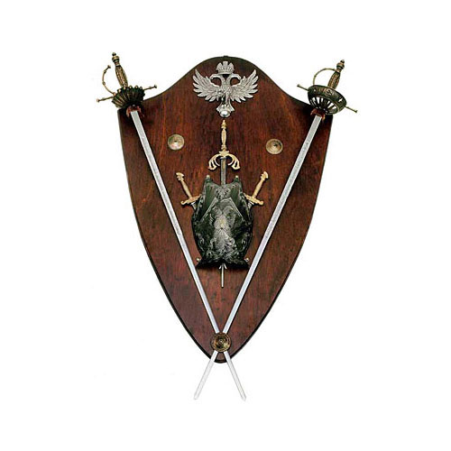 | Pannello in legno sagomato, provvisto di anelli metallici per essere appeso alla parete. Espone una ricca combinazione di elementi. Sui lati due riproduzioni ornamentali di spade da lato con elsa a conchiglia tipiche del XVI secolo che si incrociano in punta, realizzate con lama in acciaio e fornimento in metallo fuso ottonato. In capo un'aquila bicipite coronata in metallo lucido. Al centro un pettorale da corazza in metallo brunito effigiato con un'aquila bicipite incisa, sotto il quale si incrociano due stiletti e uno spadino aventi lama in acciaio e fornimento in metallo fuso dorato. Dimensioni 102 X 70 X 18 cm.