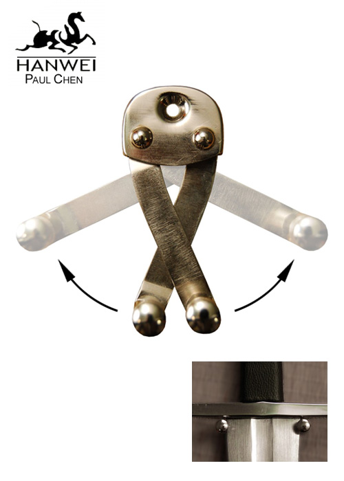 | Espositore da muro progettato per esporre le spade a parete. La sua azione a forbice consente di bloccare la lama della spada alla guardia, è il peso della spada stessa che permette la presa. I perni di fissaggio sono filettati internamente e regolabili, consentono diversi spessori di protezione e di presa e sono scanalati per fornire una posizionamento per le lame. Dettagli: - Materiale: acciaio, finitura nichelata