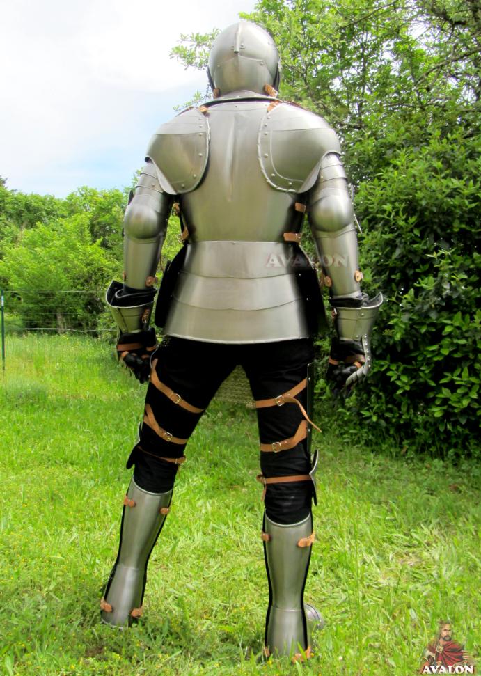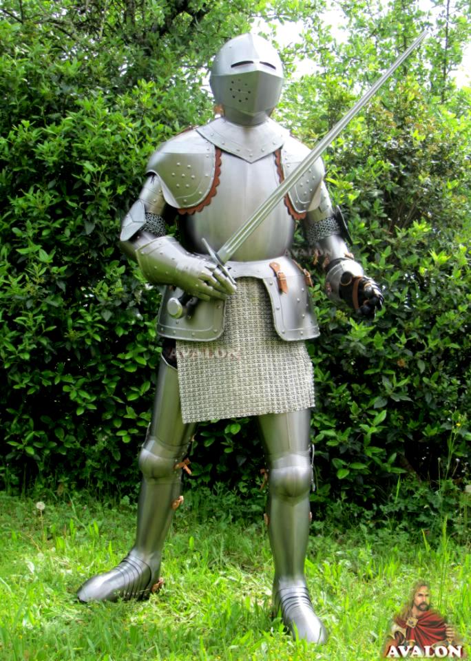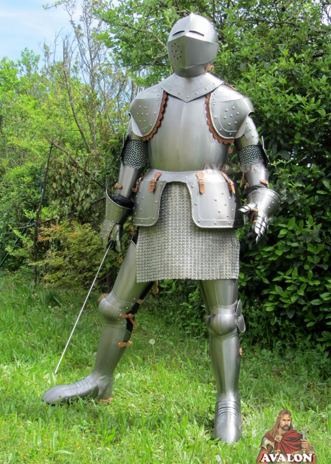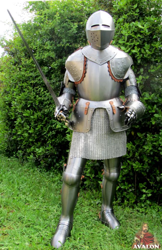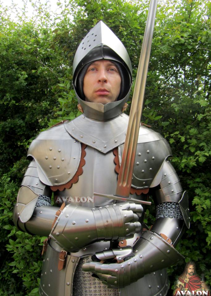Armatura medievale indossabile (lucida) realizzata in acciaio lavorato a mano con base in legno e spadone in acciaio.