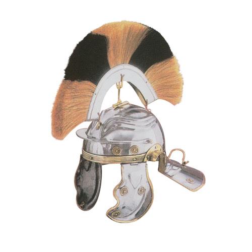 Elmo romano Imperiale Gallico con cresta longitudinale posta su un cimiero inserito sul coppo tramite un sostegno a forchetta ricostruito con precisione come in origine.