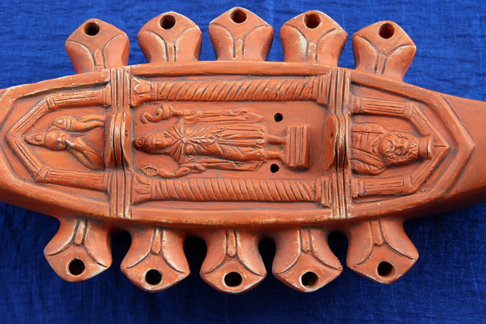 Riproduzione di una Lucerna a forma di nave dedicata a Iside , con ansa terminale a ricciolo. Al centro Iside su un basamento, con sistro nella destra, cista e ureo nella sinistra. La figura è chiusa tra due colonne corinzie sec.I D.C., scultura in terracotta, le lucerne nell'antichità servivano per illuminare le abitazioni.
