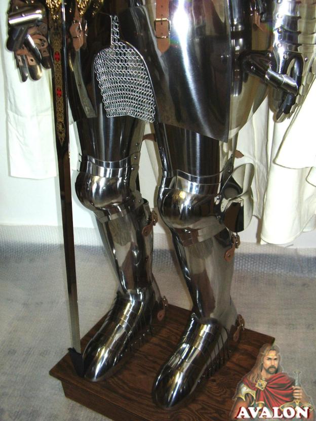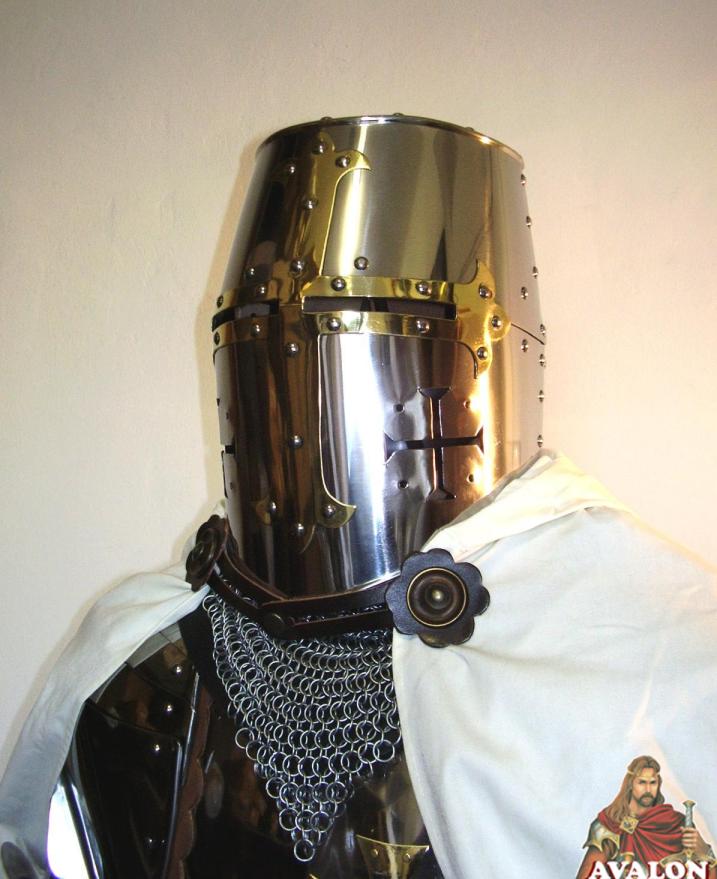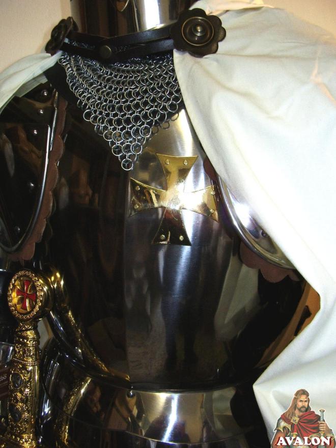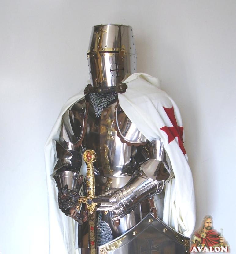 Armatura Template riprende la simbologia dei cavalieri Templari da modelli del quindicesimo secolo, dall'elmo con croce patente. Armatura Templare realizzata in acciaio, sostegno e base in legno, ideale per la rievocazione storica.