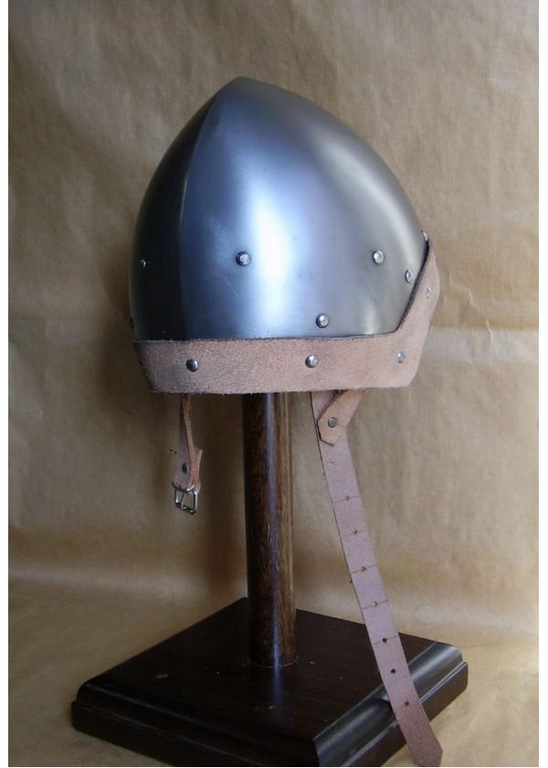 Elmo Bacinetto indossato dalla fanteria durante la Guerra dei Cento Anni. Questo tipo di elmo, si distingue per la forma del coppo leggermente appuntita.