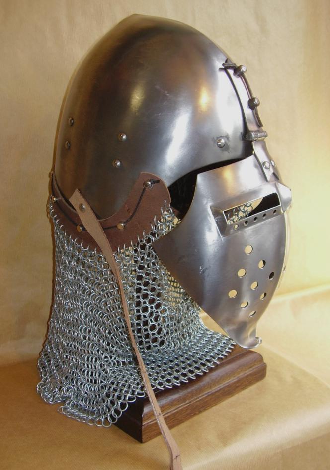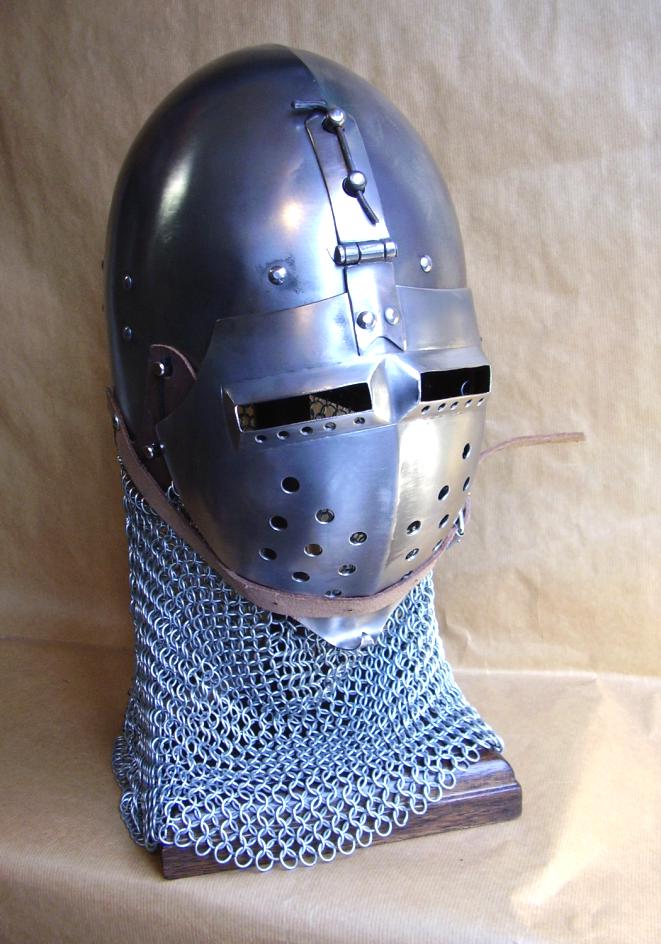 Elmo Bacinetto con visiera corazzata rimovibile (Klappvisor) di origine germanica. Elmo medievale da combattimento battle-ready, caratterizzato da una forma appuntita del coppo e la leggera inclinazione all'indietro.