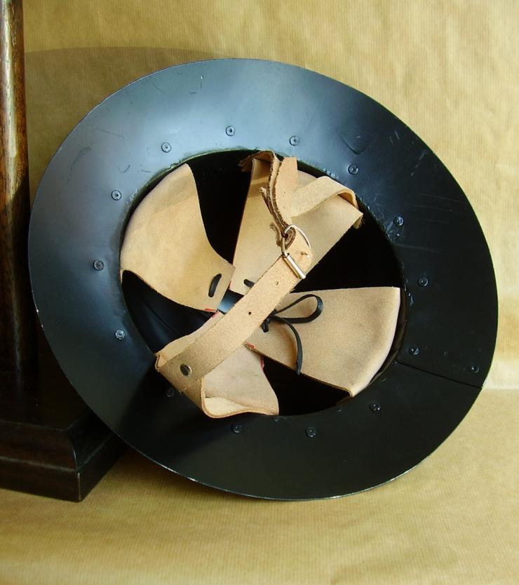 Cappello d'Arme a coppo tondeggiante, è un tipico elmo medievale costolato in mezzeria con una banda di rinforzo in acciaio rivettata e tesa ampia.