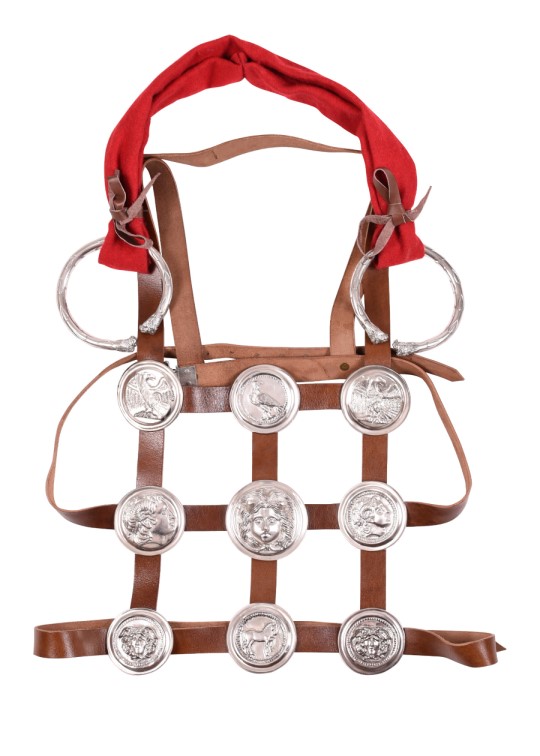 Phalerae romana, realizzate in ottone stagnato Le Phalerae traggono origine dai piatti decorativi in metallo, che servivano come premi e riconoscimenti nelle competizioni sportive o come regali. Successivamente furono usati nelle legioni romane per onorificenze, paragonabili ad una medaglia o ad un premio al valore. Le Phalerae venivano assegnate a singoli soldati così come a intere unità o truppe. Quando le Phalerae venivano assegnate a intere unità, venivano attaccate al rispettivo stendardo. Le falere qui offerte sono, paragonabili agli originali, fissate su un telaio di cinghie di cuoio, che viene indossato come un gilet e chiuso sulla schiena con cinghie e fibbie. A livello delle clavicole sono presenti sottili cinghie alle quali è legata una sciarpa di lana rossa, la focale. Due torque stagnati, anch'essi distintivi d'onore, sono agganciati alle asole inferiori del focale. Dettagli: - Altezza: circa 32 cm - Larghezza: circa 30 cm - Circonferenza spalle/torace regolabile: da circa 102 cm a massimo 124 cm - Circonferenza vita, regolabile: da circa 102 cm a massimo 121 cm - Diametro della medaglia: circa 7-9 cm - Diametro della coppia: circa 12 cm - Materiale: ottone stagnato, circa 3 mm e pelle conciata al vegetale, circa 3 mm - Peso: circa 1,6 kg