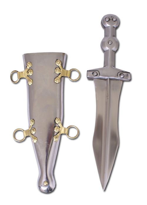 Pugnale romano in dotazione dei legionari romani tra il I secolo a.C. e la prima metà del I secolo d.C.. Veniva portato appeso sul lato sinistro dai legionari, mentre nei centurioni pendeva sulla destra. Lama in acciaio a doppio taglio provvisto di fodero con raccordi in ottone e dotato di anelli di sospensione. Dettagli: Lunghezza totale: circa. 32,5 cm