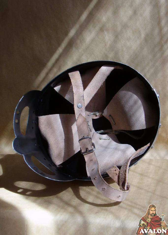 L'interno dell'elmo presenta una cuffia in cuoio regolabile per essere indossato, l'elmo ha una sottogola in cuoio e fibbia in ottone.