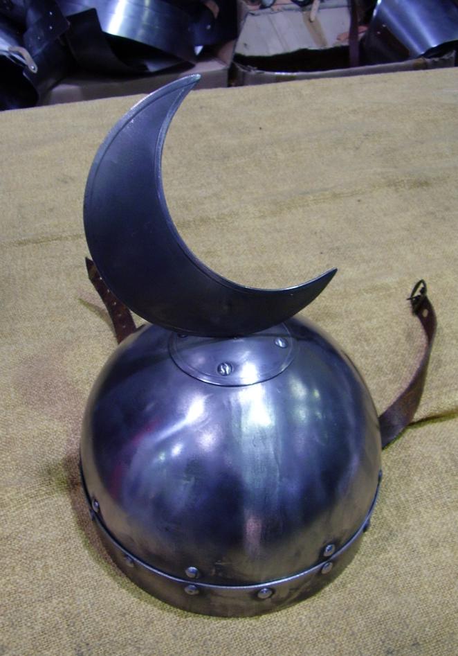 Elmo Medievale in stile arabo elmo del tipo Cervelliera Semplice formato da una calotta in acciaio liscia con mezza luna centrale, nei combattimenti era utilizzato sopra un camaglio ad anelli in ferro per proteggere l'intera testa del combattente.
