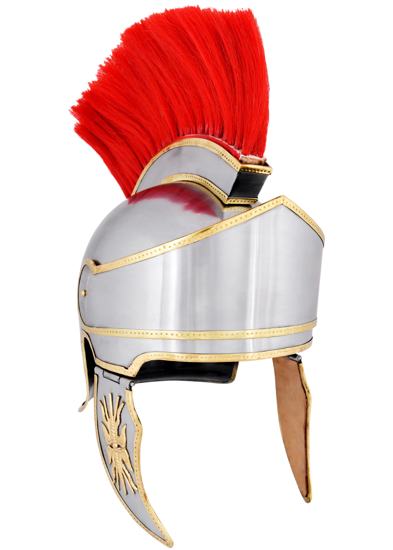Elmo con paraguancie flessibili rivestite in pelle al suo interno. La cresta rossa può essere montata separatamente. Riproduzione tratta dai rilievi presenti sull'Arco di Costantino e che in origine facevano parte del grande fregio di Traiano. Esso raffigurava le gesta dell'imperatore Traiano al termine della conquista della Dacia, che culminava con un trionfo, quale continuazione del racconto del fregio colchide traianeo e il cui soggetto è riferibile, quindi, agli anni finali del 106-107. La Guardia pretoriana era un reparto militare dell'Impero romano che svolgeva compiti di guardia del corpo dell'imperatore. Dettagli: