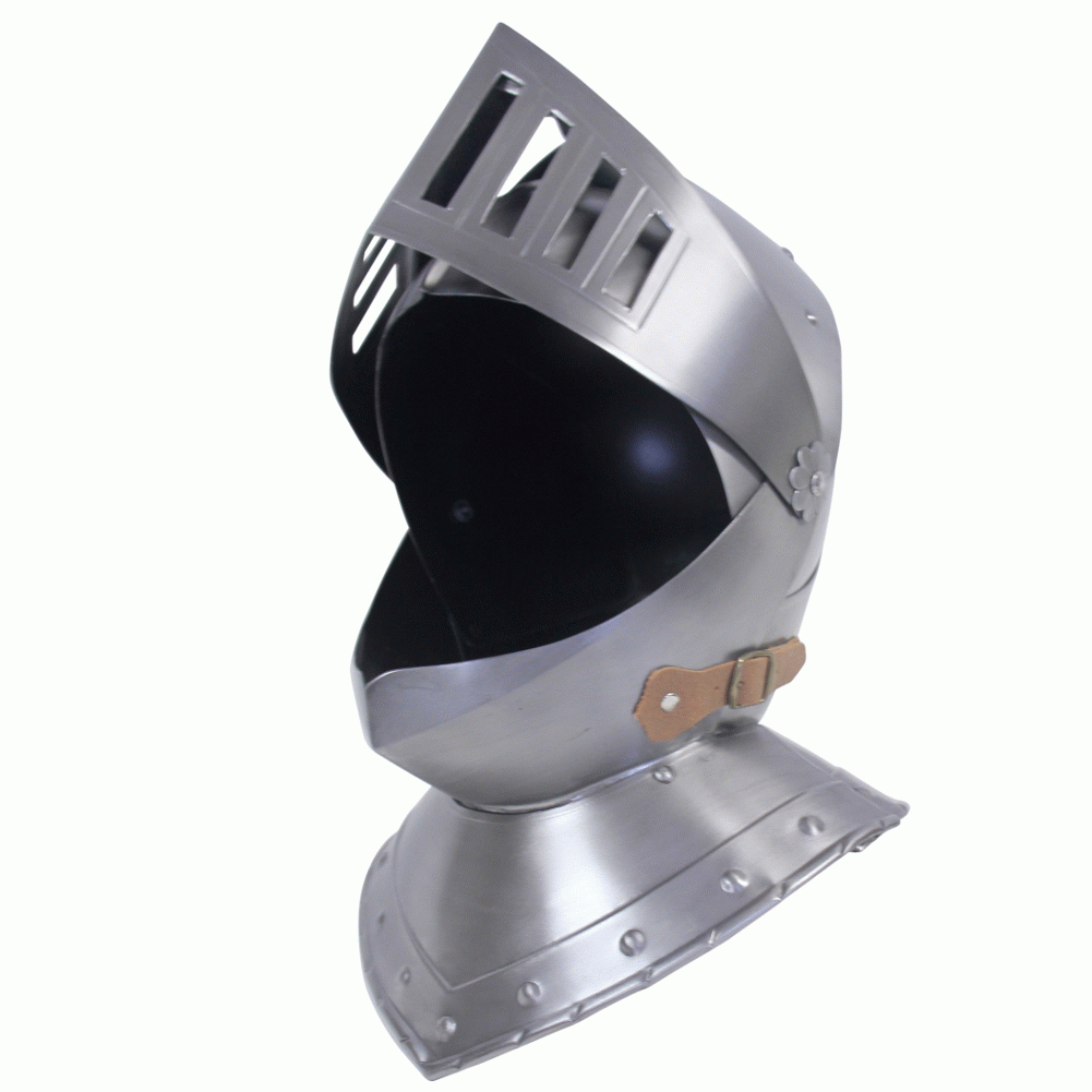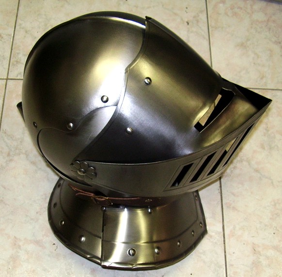 Elmo per armatura da uomo d'arme in uso in Italia nel XV secolo, interamente realizzato in ferro lavorato a mano. Dimensioni: 30x31x35.
