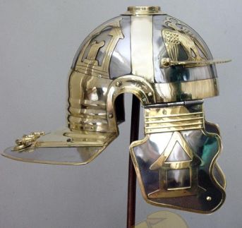 Elmo romano del tipo Imperiale Italico, paranuca ampio e basso a protezione di collo e spalle, paragnatidi mobili e paraorecchie elaborati.