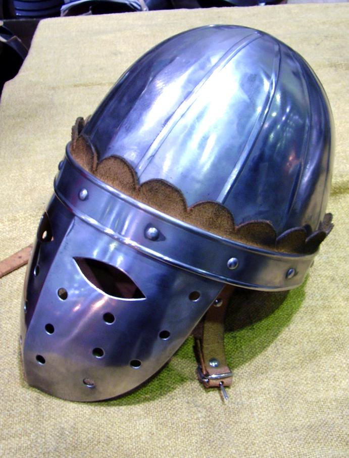 Elmo normanno a calotta semisferica, maschera frontale a protezione dell'intera faccia, interamente realizzato in acciaio, lavorato a mano, interno con calotta di cuoio regolabile per migliorarne la comodità. Elmo di origine nordica, diffuso in seguito in tutta l'Europa occidentale tra le fanterie fino alla metà del XIV secolo. Elmo da combattimento della prima metà del secolo XI, in cui è stata aggiunta una piastra sagomata per proteggere il viso, con fessure oculari e fori di ventilazione. Aperture per gli occhi forniscono una discreta visione; è stato uno dei primi tentativi di creare una protezione integrale della testa. Questo elmo è l'ideale per il combattimento, ma anche per spettacoli di rievocazione medievali. Questi tipi di elmi di solito venivano indossati sopra un camaglio ad anelli per la protezione integrale della testa. L'interno dell'elmo presenta una cuffia in cuoio regolabile per essere indossato, l'elmo ha una sottogola in cuoio con fibbia in ottone. Dettagli: