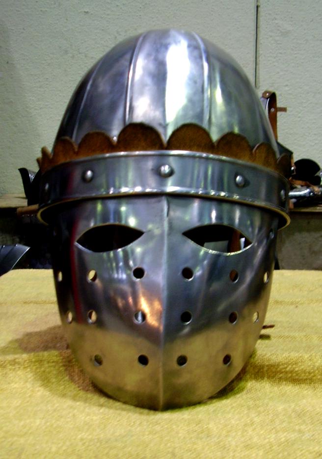 Elmi Medievali produzione e vendita, tutte le tipologie di elmi medievali: Elmo Cervelliera, Spangenhelm, elmo conico normanno, Elmo Bacinetto, Elmo Barbuta, Elmi da Combattimento, Grande Elmo Templare, Elmo da cavaliere, elmo celata alla veneziana, cappello di ferro.