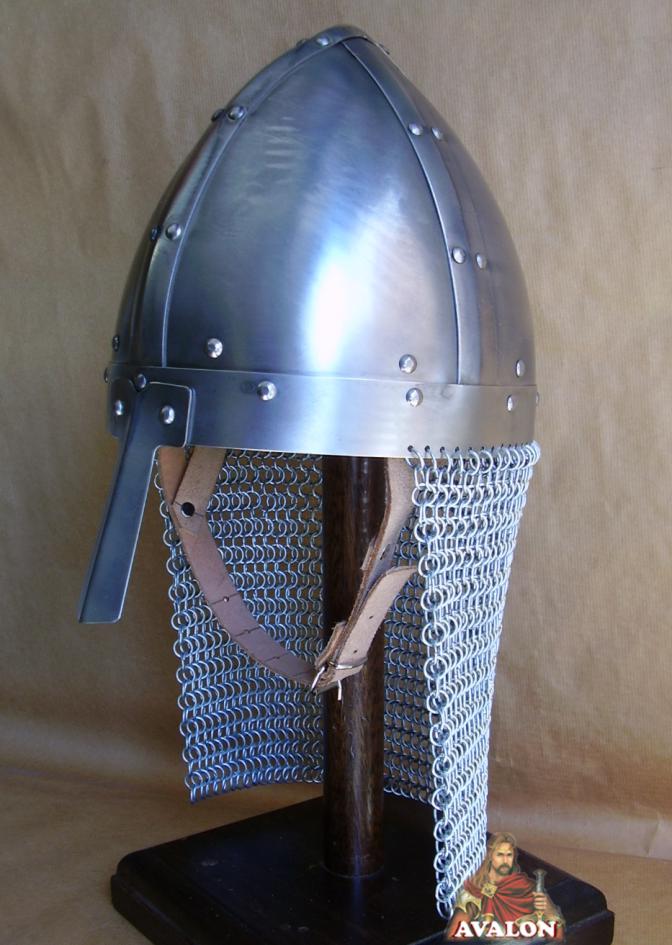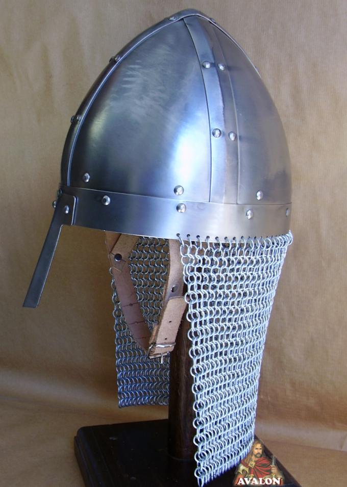 Riproduzione di un Elmo Normanno con nasale rivettato del tipo Spangenhelm. Elmo Normanno a nasale provvisto di maglia di ferro ad anelli zincati per proteggere la parte posteriore del collo.