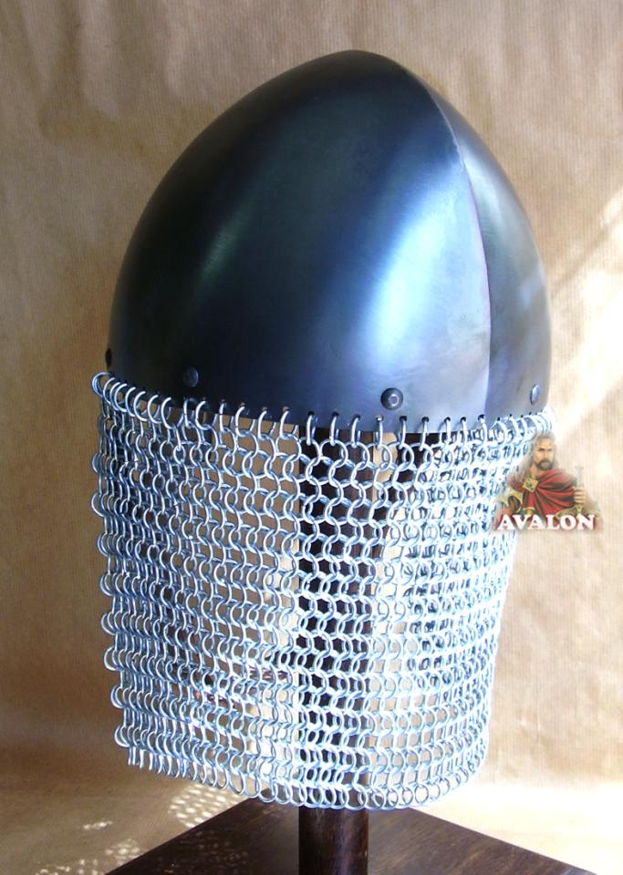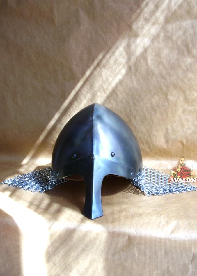 Elmo Nasale di tipo Normanno con maglia ad anelli di ferro a protezione del collo, elmo da combattimento caratterizzato dal possesso di una barra sporgente che proteggere il naso e il centro del viso